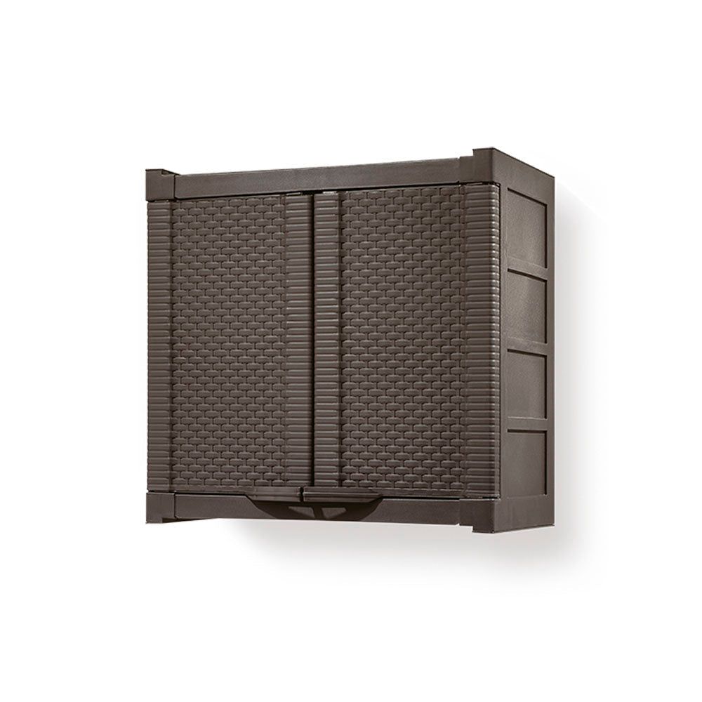 Gabinete para colgar en pared o usar al nivel del piso. Excelente capacidad y resistencia. Un complemento ideal para amoblar los espacios altos al interior del hogar. De apariencia rattán; un diseño muy funcional. Beneficios: Resiste hasta 50 kg por entrepaño. Fácil de armar. Diseñado para colgar en la pared. Diseño elegante que imita el rattan para un toque sofisticado. Amplio espacio de almacenamiento con doble acceso. Fabricación en materiales duraderos y fáciles de limpiar. Versátil para uso en interiores y exteriores. Atractivo diseño que se integra en cualquier decoración. Solución práctica para mantener organizados diferentes espacios.
