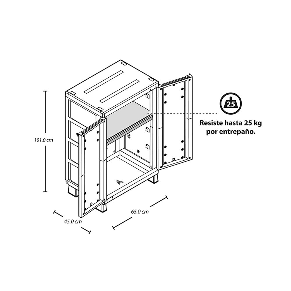 Armario Mediano con textura Rattan, con 2 entrepaños ajustables que resisten hasta 25 Kg cada uno. Fácil de armar, mover y limpiar. Con la resistencia y beneficios del plástico. Excelente capacidad interior, con orificio para uso de candado para mayor seguridad. Apariencia artesanal y elegante que acompaña tus espacios de la mejor manera. Beneficios: Diseño elegante que imita el rattan natural. Amplio espacio de almacenamiento para múltiples necesidades. Fabricado con materiales duraderos y fáciles de mantener. Versátil para uso en interiores y exteriores. Aporta un toque natural y sofisticado a tu decoración. Solución práctica para mantener tus espacios ordenados. Manijas verticales. Mejor agarre y diseño. 2 Entrepaños regulables. Resiste hasta 25 kg por entrepaño. Fácil de mover. Fácil de armar.
