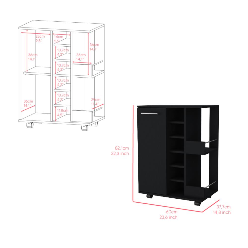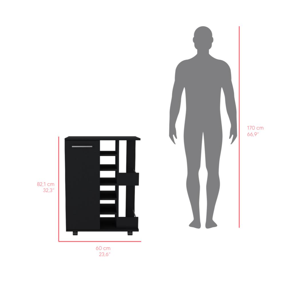 Bar, con espacio para ubicar botellas de vino, 1 puerta con manija, 1 entrepaño móvil y rodachinas.