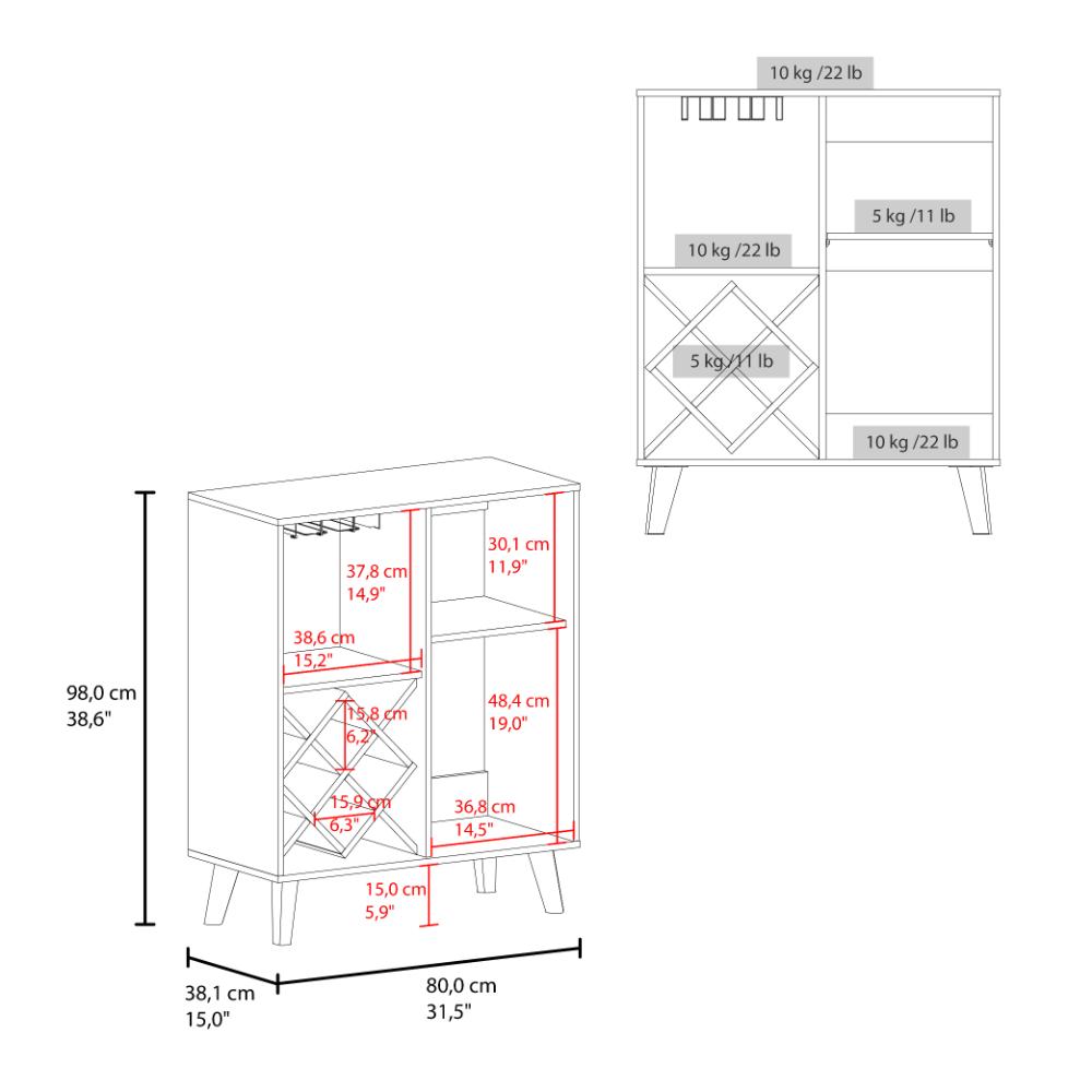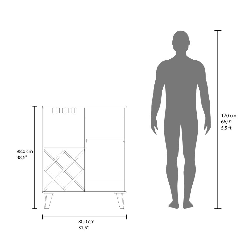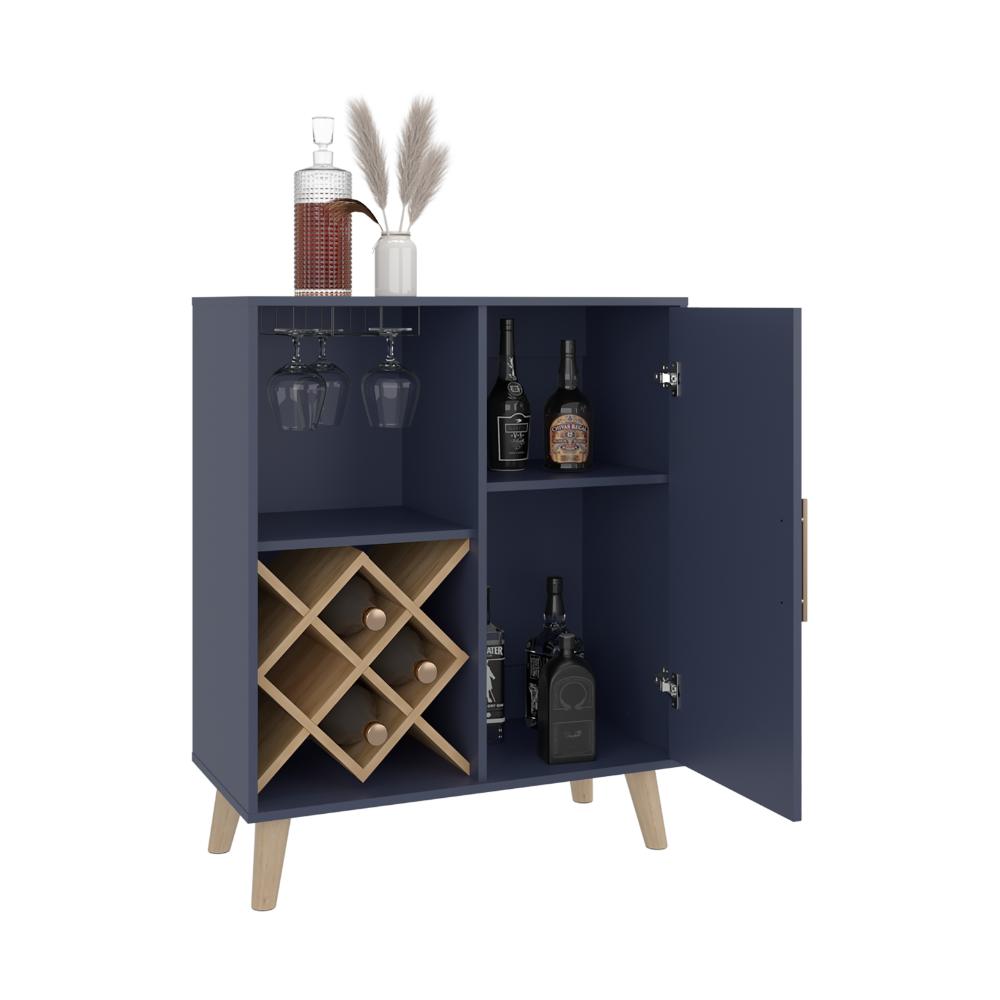 Bar, con espacio para botellas y porta copas, 2 puertas batientes y patas de madera.