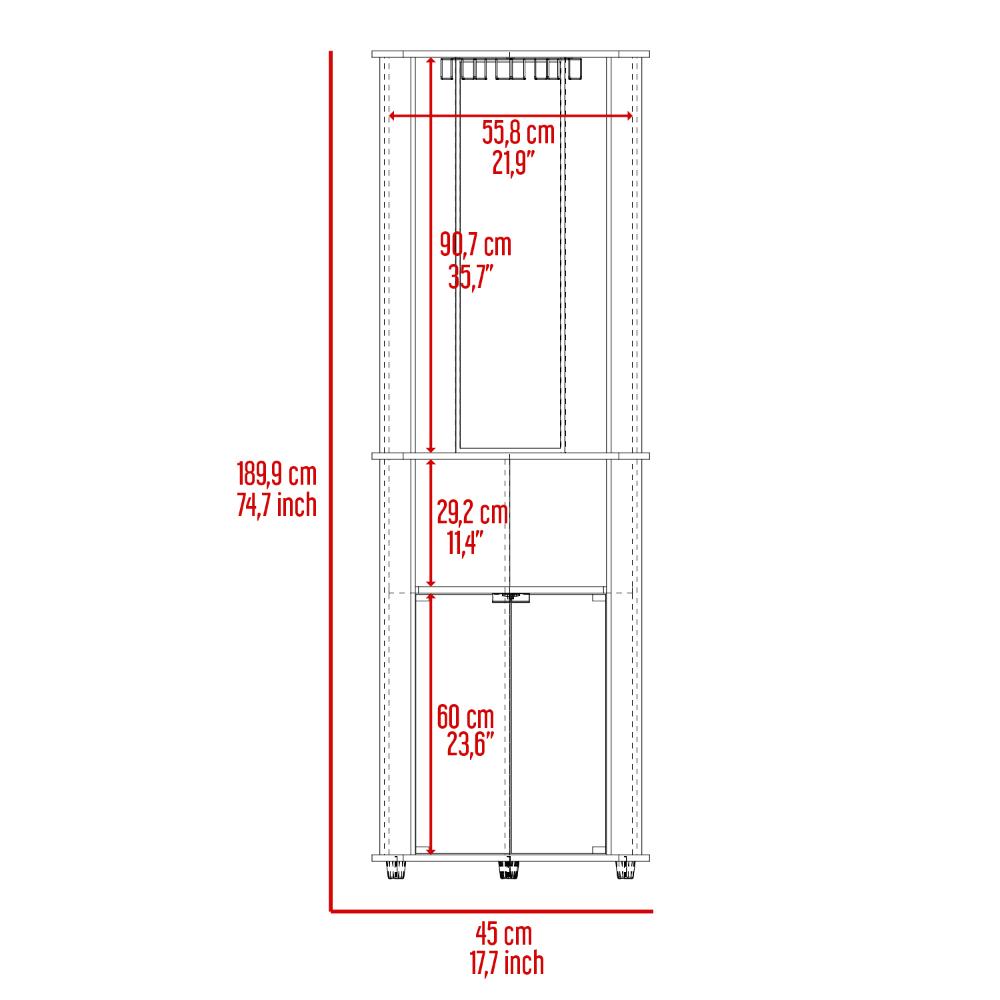 Bar, con colgador de copas, dos puertas de vidrio, espejo, espacio para almacenar botellas y objetos del bar.