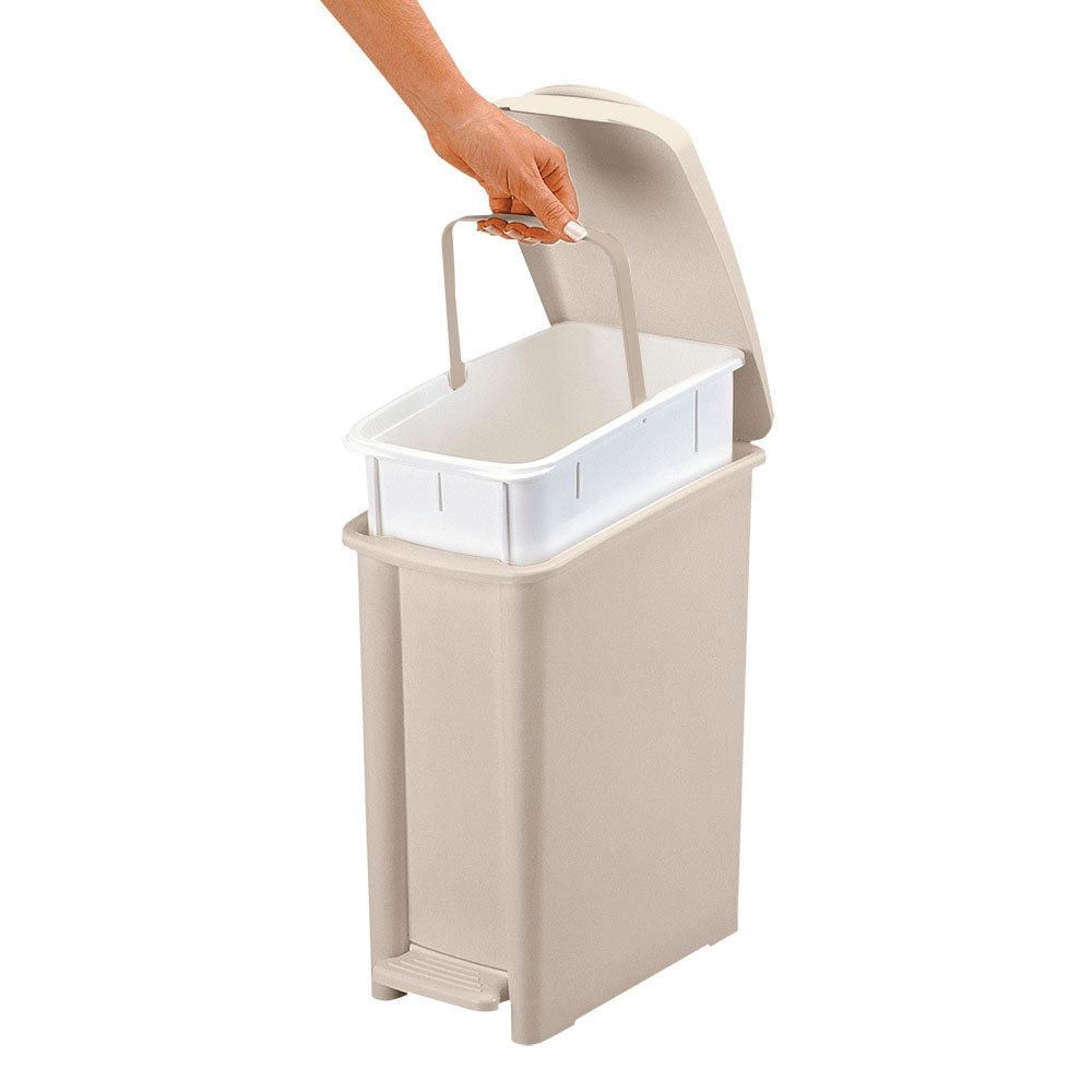 Basurero de pedal con capacidad de 10 Litros. Tapa Abatible y de acción por pedal. De suave apertura y cierre. Balde interior con manija que facilita retirar la bolsa con desechos. Optimiza espacio y eficiencia en el hogar, cuenta con un diseño renovado para tus espacios por su diseño slim.
