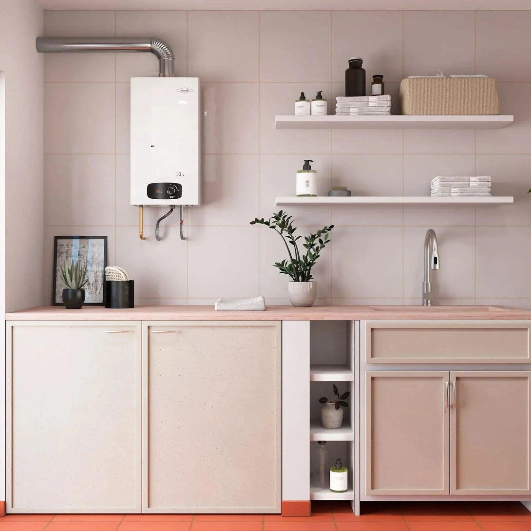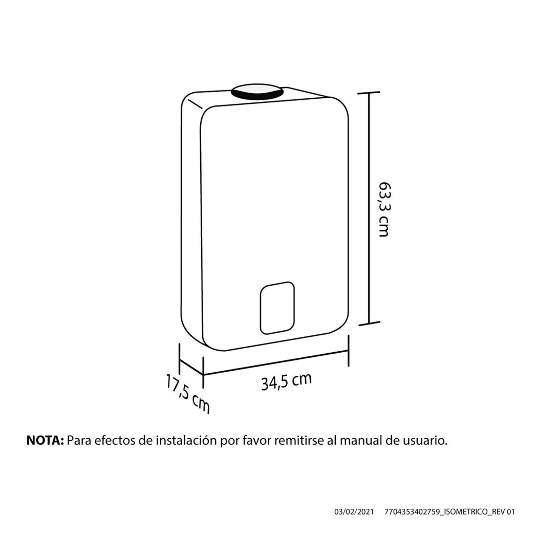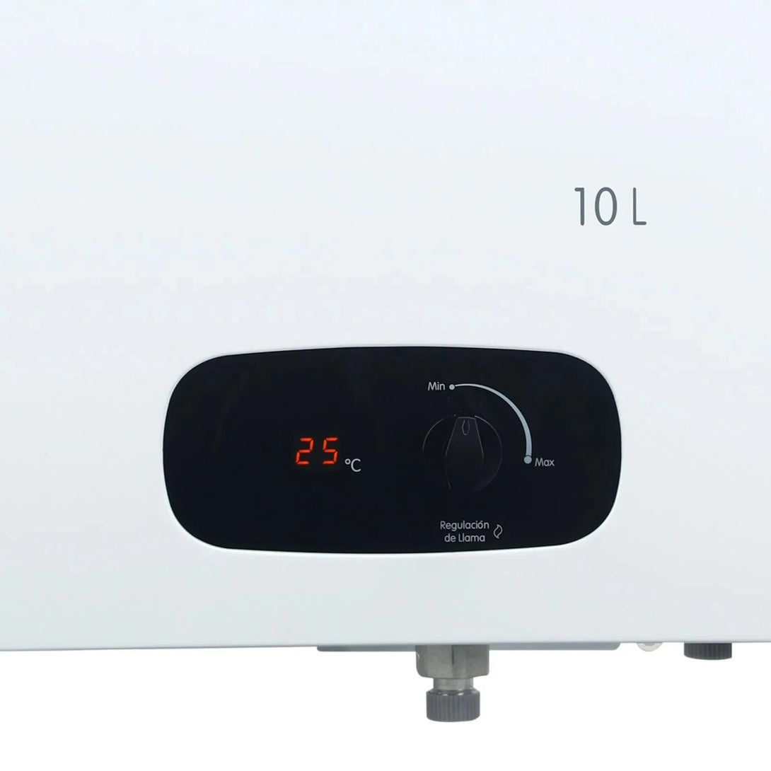 Calentador de agua, paso a gas natural, capacidad de 10 Lts por minuto, tiro forzado, temperatura regulable y Display indicador para visualizar la temperatura de salida del agua e información de funcionamiento. Operación automática, perillas de fácil manejo para controlar la temperatura del agua y el ahorro del gas, además cuenta con visor de llama para observar el funcionamiento del quemador, sistema de seguridad y temporizador que apaga el calentador luego de 20 minutos de uso continuo. Incluye ducto de evacuación y requiere toma eléctrica con polo a tierra, el ducto puede ir directo al exterior.