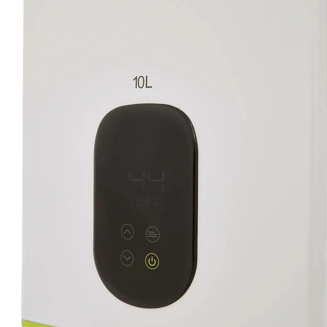 Calentador de agua, de paso a gas natural, con capacidad de 10 Lts por minuto, tiro forzado, con sistema modulante, display touch, operación automática, visor de llama, sistema de seguridad y temporizador que apaga el calentador luego de 20 minutos de uso continuo.