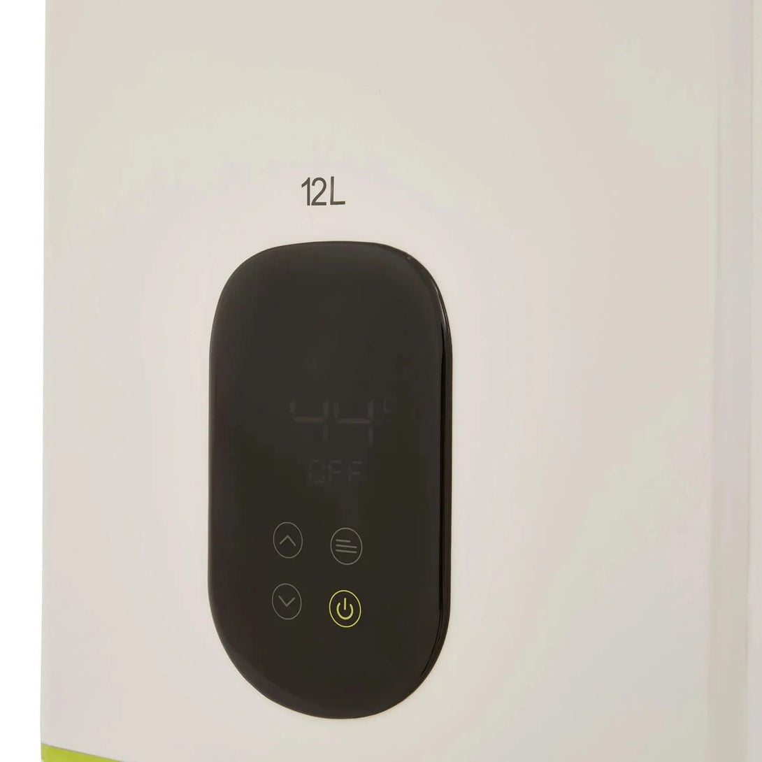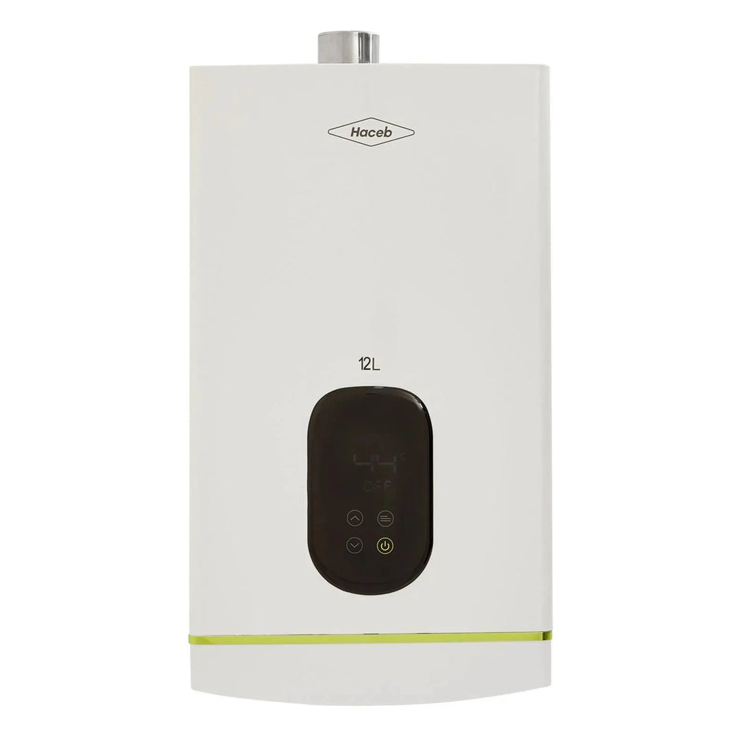 Calentador de agua, de paso a gas natural, con capacidad de 12 Lts por minuto, tiro forzado, con sistema modulante, display touch, operación automática, visor de llama, sistema de seguridad y temporizador que apaga el calentador luego de 20 minutos de uso continuo.