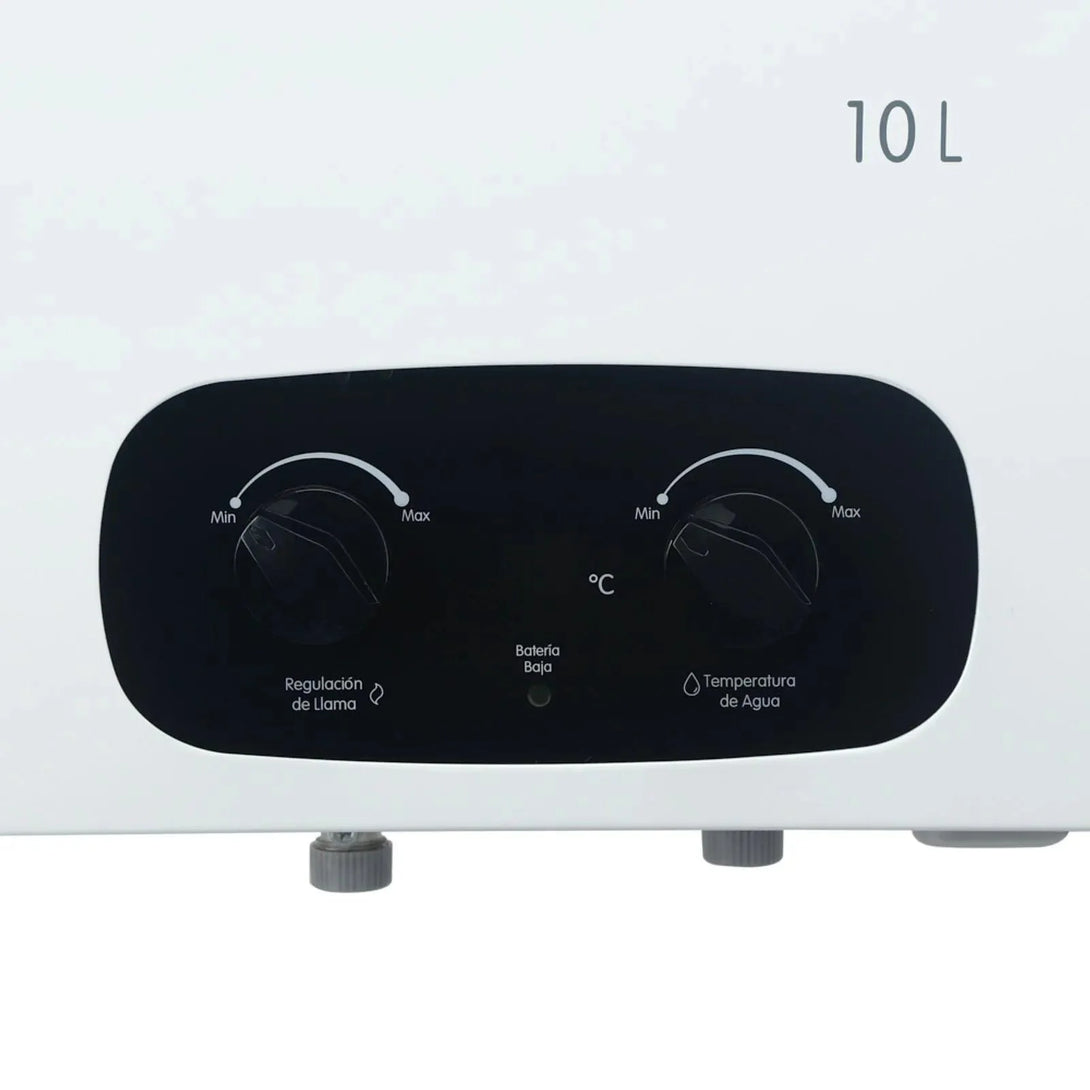 Calentador de agua, paso a gas natural, capacidad de 10 Lts por minuto, tiro natural, temperatura regulable y Display indicador para visualizar la temperatura de salida del agua e información de funcionamiento. Perillas de fácil manejo para controlar la temperatura del agua y el ahorro del gas, además cuenta con visor de llama para observar el funcionamiento del quemador, sistema de seguridad y temporizador que apaga el calentador luego de 20 minutos de uso continuo. Requiere ducto de evacuación y baterías.