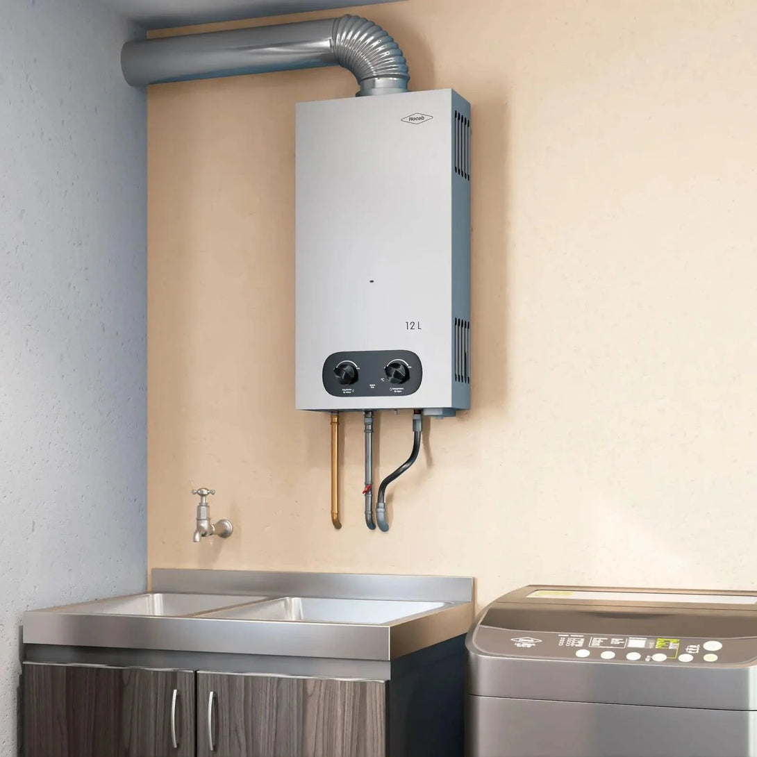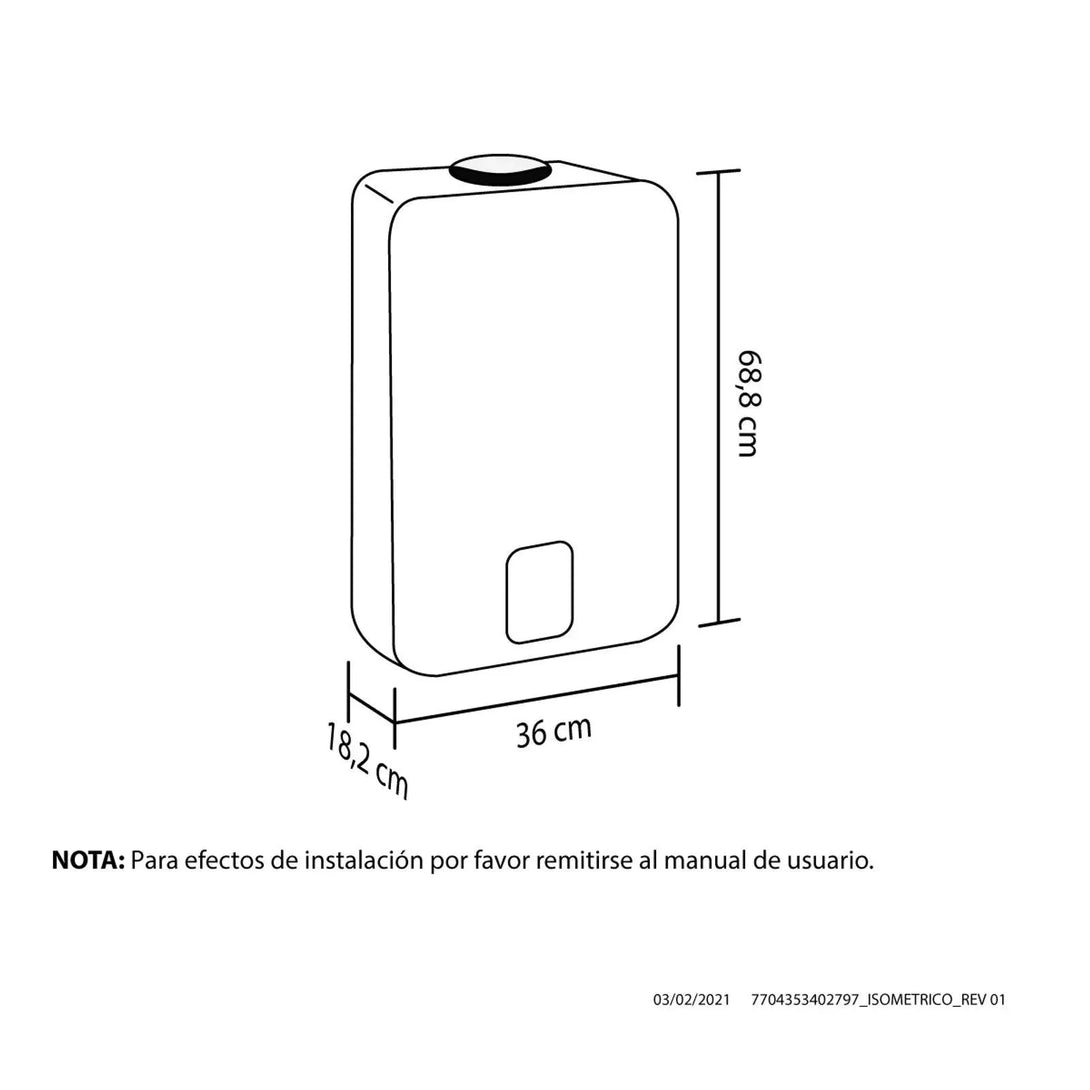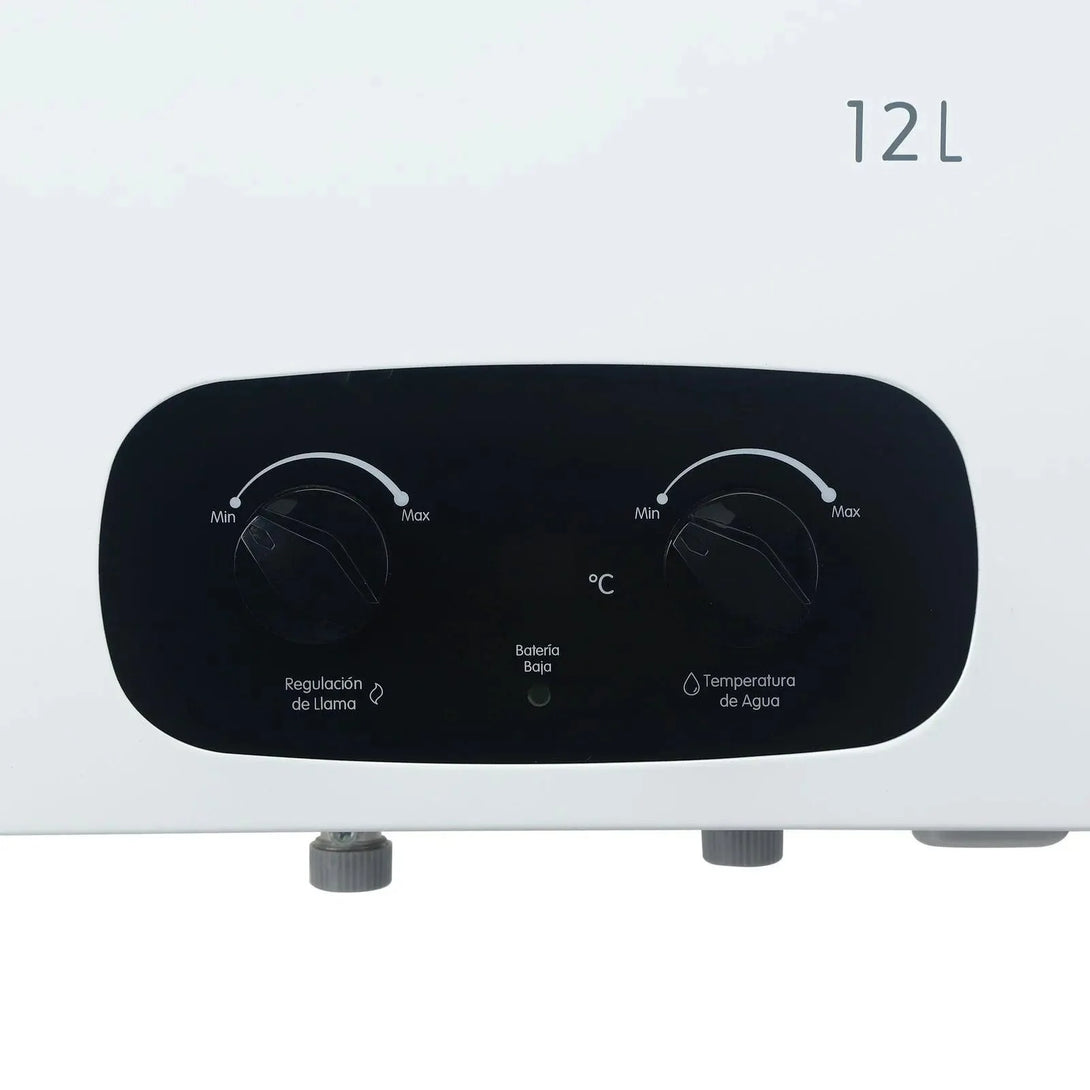 Calentador de agua, paso a gas natural, capacidad 12 Lts por minuto, tiro natural, temperatura regulable y Display indicador para visualizar la temperatura de salida del agua e información de funcionamiento. Perillas de fácil manejo para controlar la temperatura del agua y el ahorro del gas, además cuenta con visor de llama para observar el funcionamiento del quemador, sistema de seguridad y temporizador que apaga el calentador luego de 20 minutos de uso continuo. Requiere ducto de evacuación y baterías.