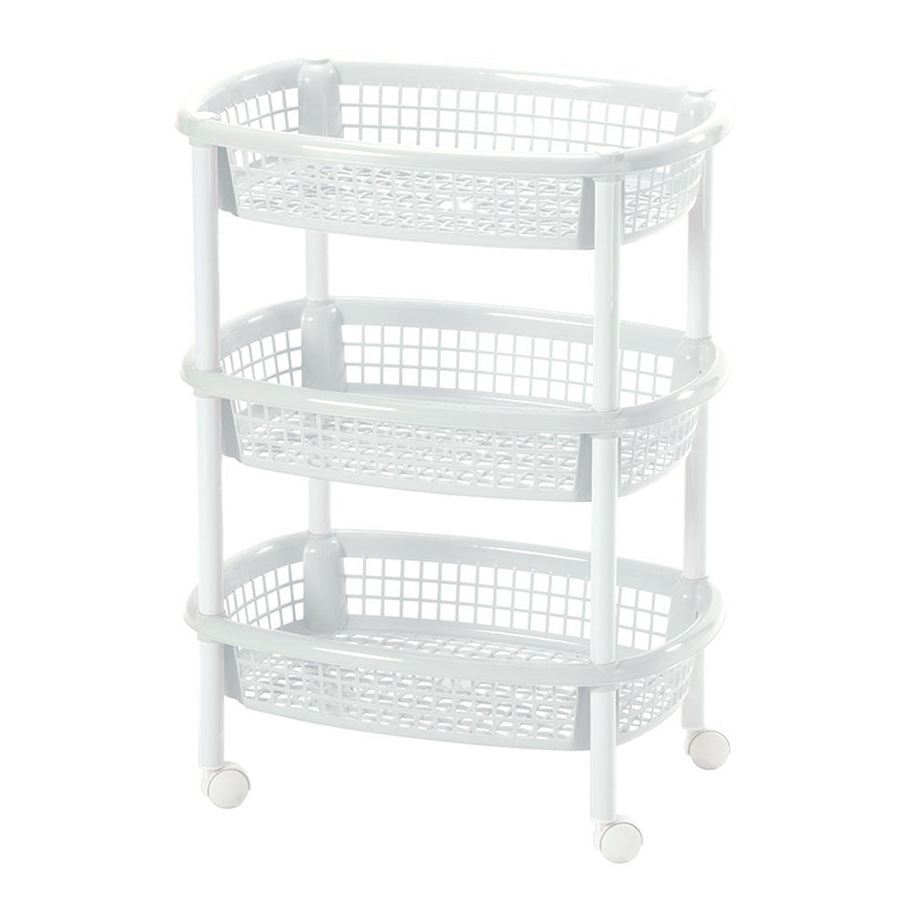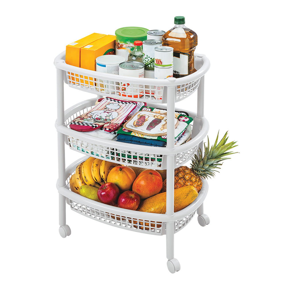 Canasta móvil ovalada que incluye tres niveles para organizar. Tiene rodachinas. Fácil de armar, no requiere herramientas. Ideal para organizar en casa todo tipo de objetos. No se oxida y es fácil de limpiar. Úsala en cocina, baños, cuartos de niños, como organizador auxiliar. Es tejida y permite oxigenar los productos o alimentos que guarde.