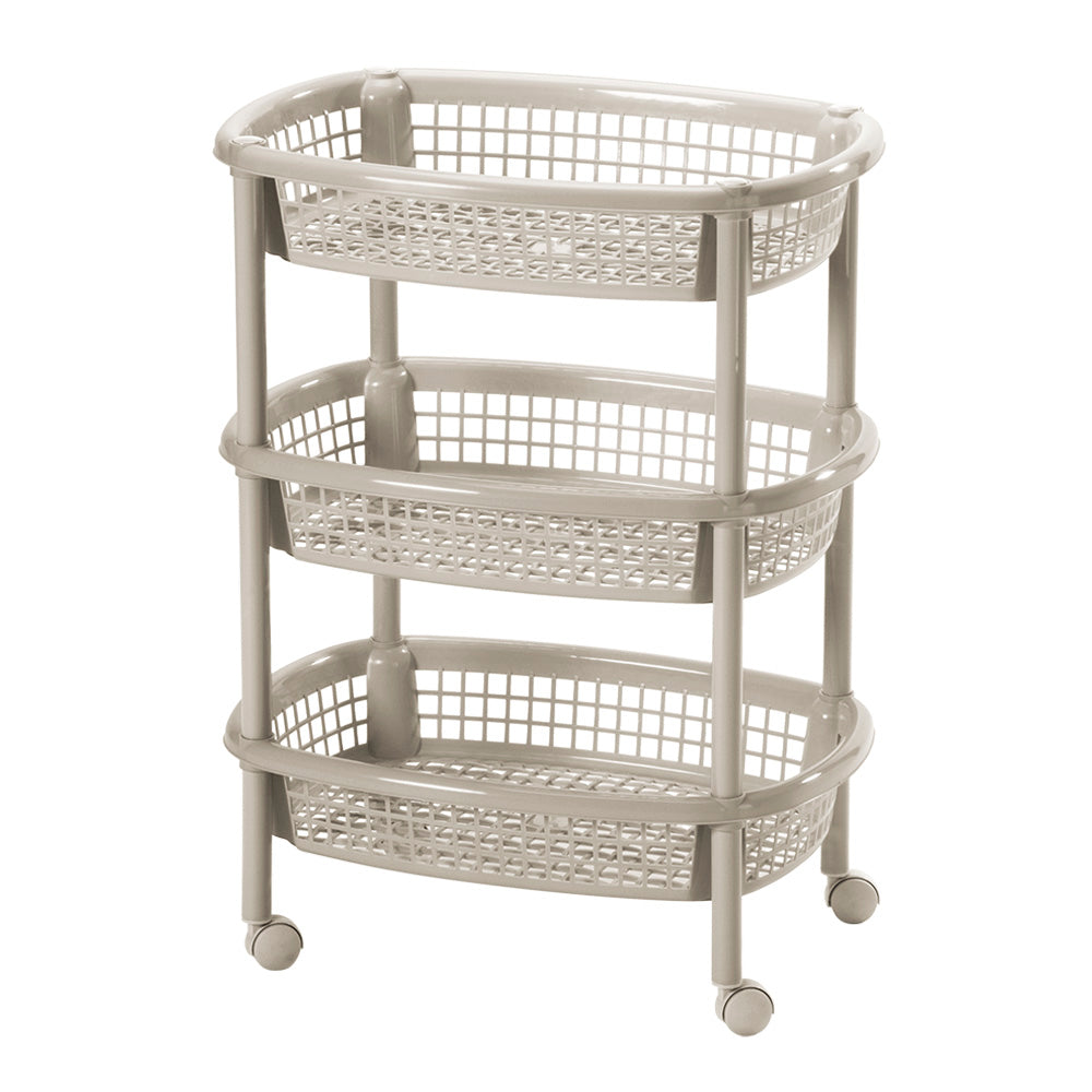 Canasta móvil ovalada que incluye tres niveles para organizar. Tiene rodachinas. Fácil de armar, no requiere herramientas. Ideal para organizar en casa todo tipo de objetos. No se oxida y es fácil de limpiar. Úsala en cocina, baños, cuartos de niños, como organizador auxiliar. Es tejida y permite oxigenar los productos o alimentos que guarde.