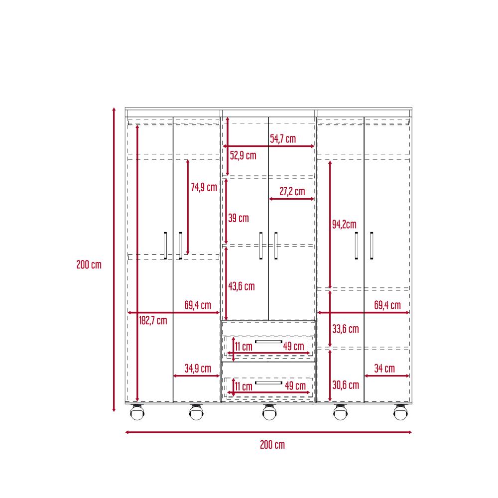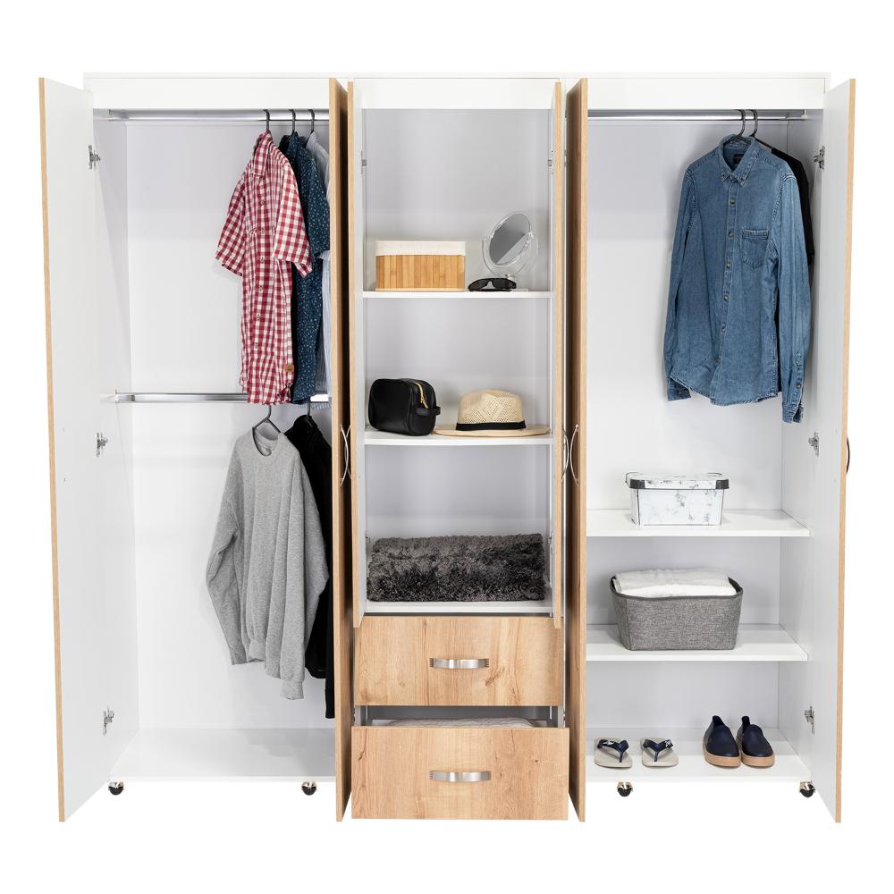 Closet, con amplios espacios y entrepaños para organizar, 6 puertas abatibles, 3 tubos cromados, 2 cajones organizadores, y deslizadores de plástico para apoyo al piso.