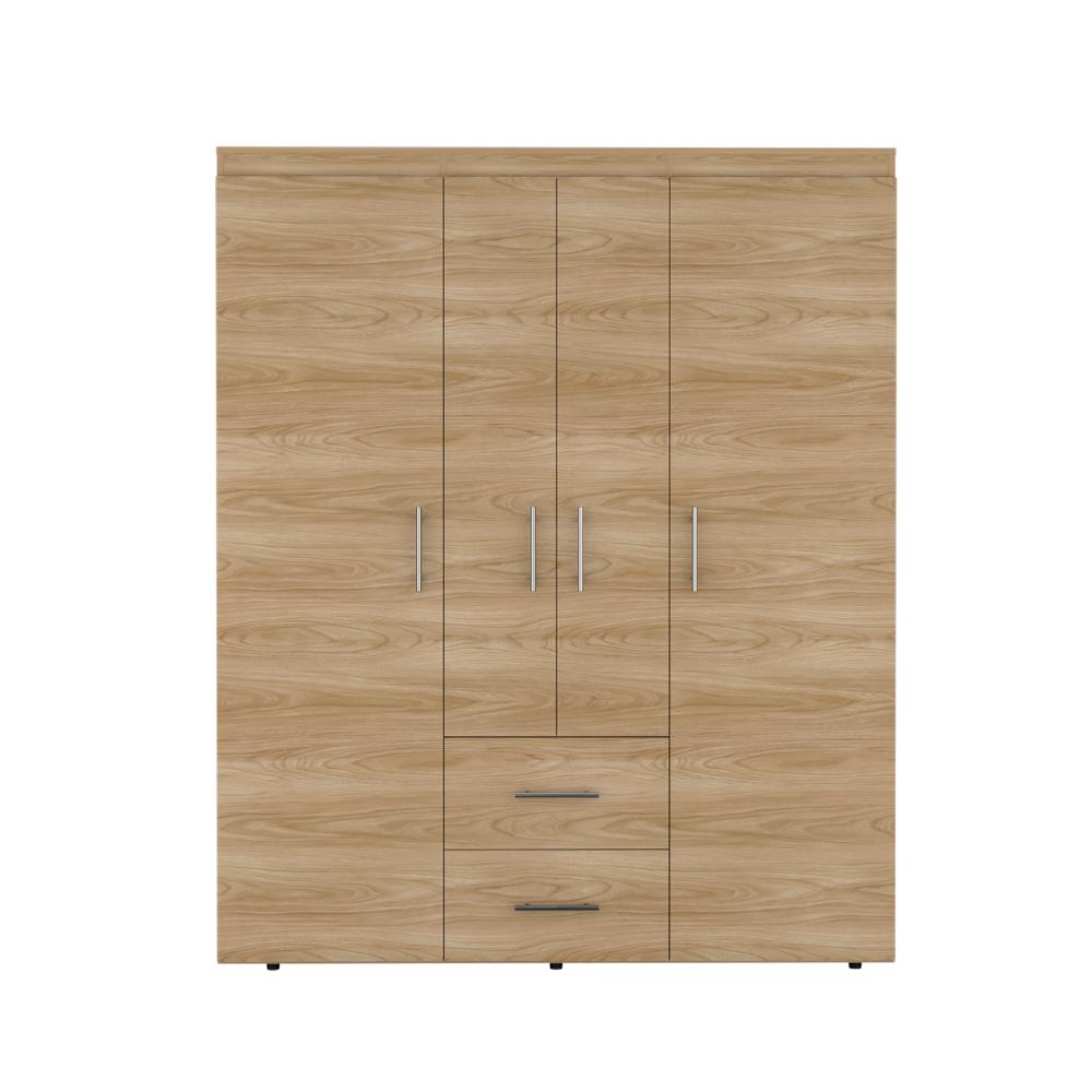 Closet, con cuatro puertas batientes, dos cajones, tres tubos pata colgar ropa y amplios espacios de guardado. Con manijas doradas.