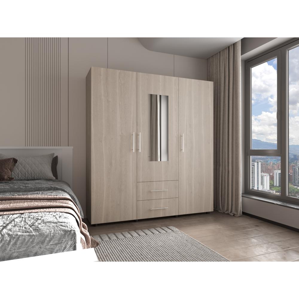 Closet, con amplios espacios y entrepaños para organizar, tres tubos ovalados para colgar ropa, dos cajones y organizadores multiusos, manijas metálicas, puerta espejo.
