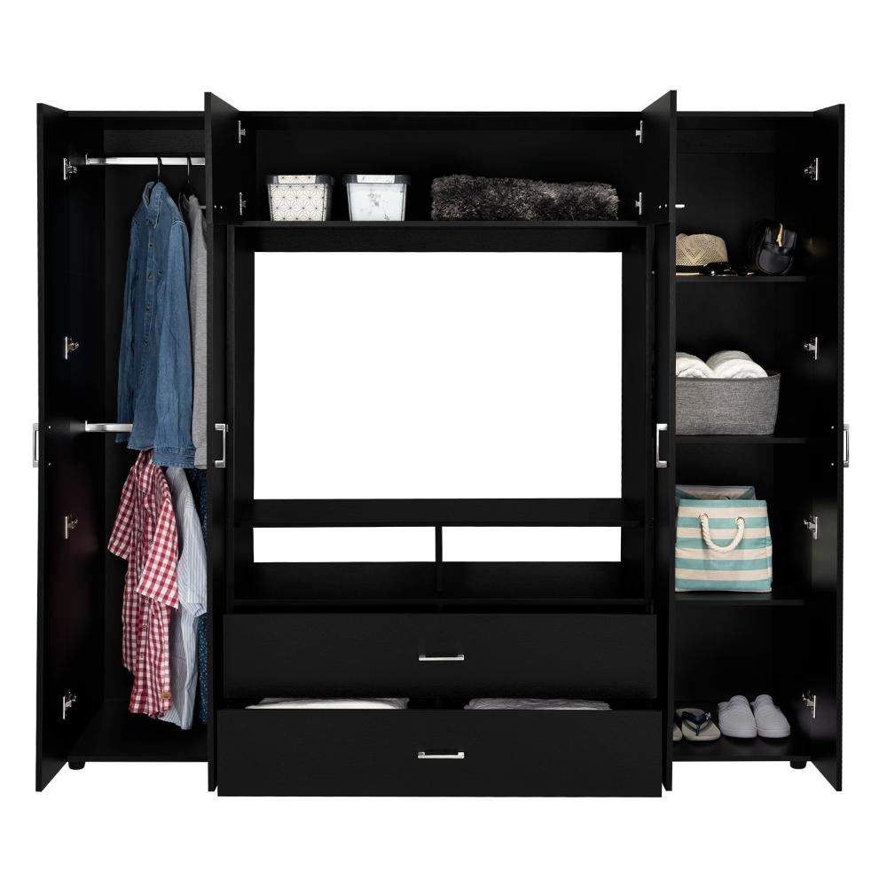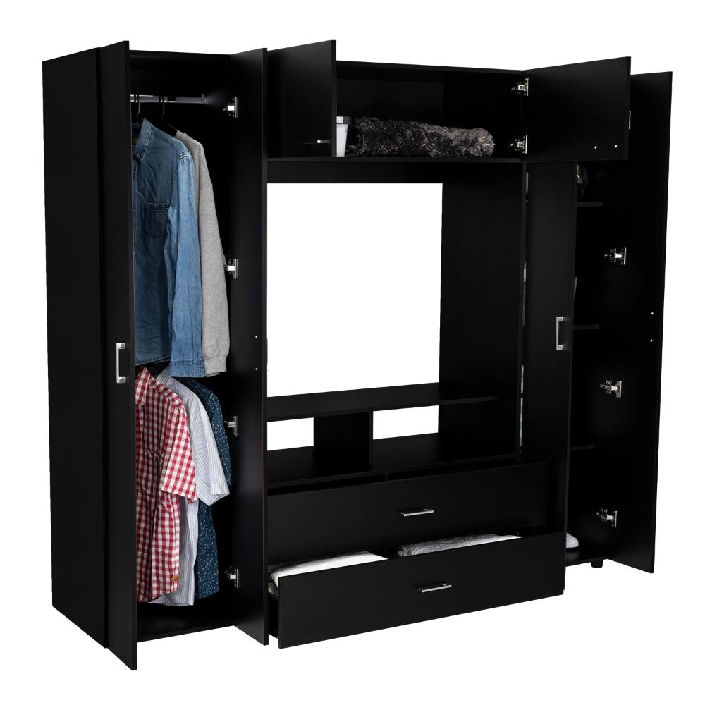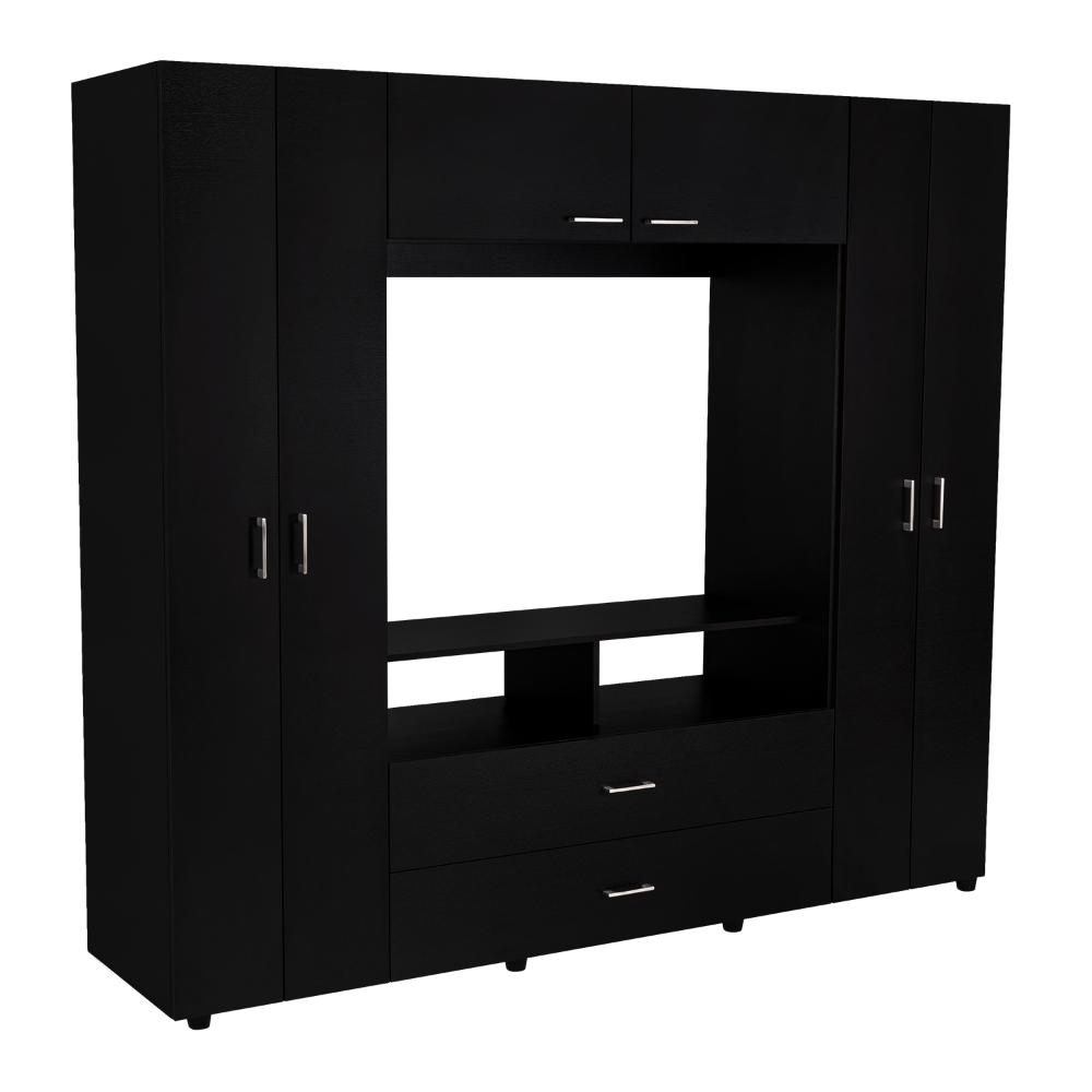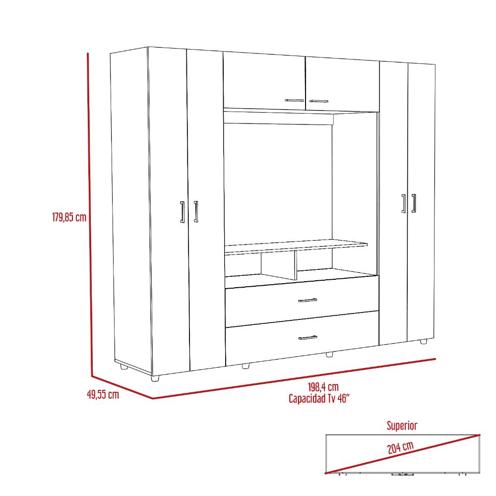 Closet, con amplio superficie inferior, espacio para tv de 46", 2 tubos cromados, 2 cajones organizadores amplios, 4 entrepaños, y, 6 puertas batientes.
