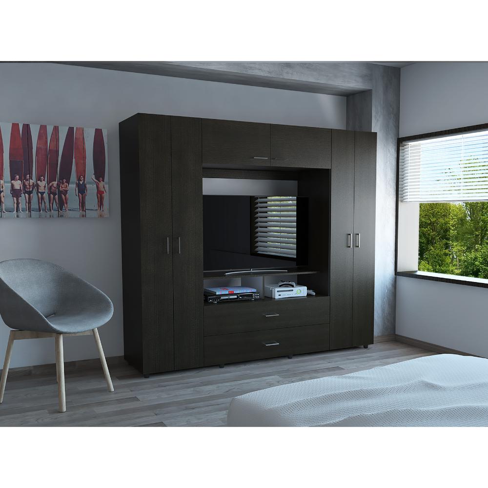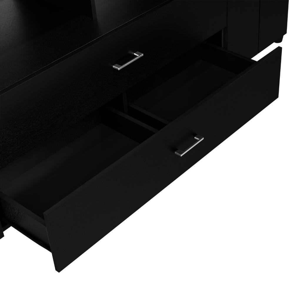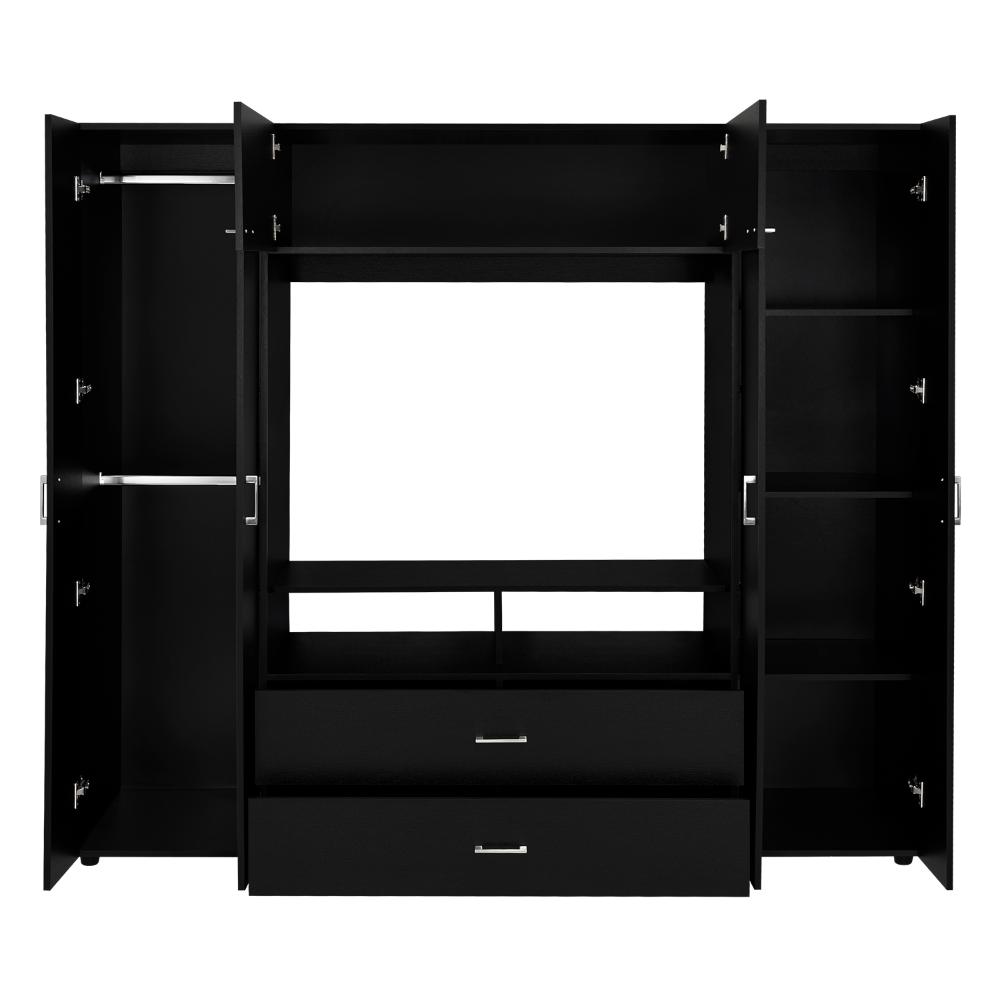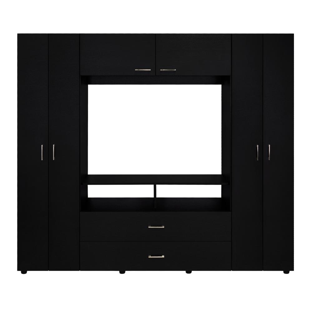 Closet, con amplio superficie inferior, espacio para tv de 46", 2 tubos cromados, 2 cajones organizadores amplios, 4 entrepaños, y, 6 puertas batientes.