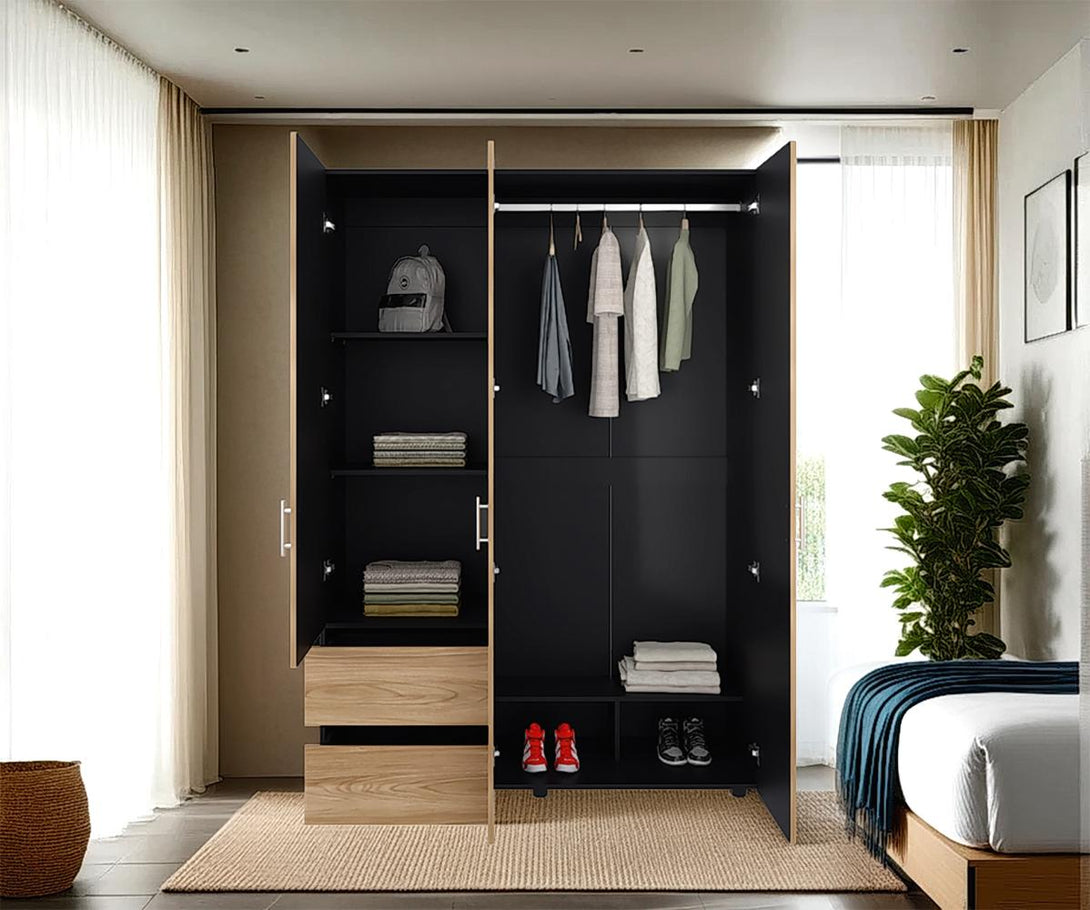Closet, con colgador para ropa, tres puestas abatibles, entrepaños para poner ropa, dos cajones.