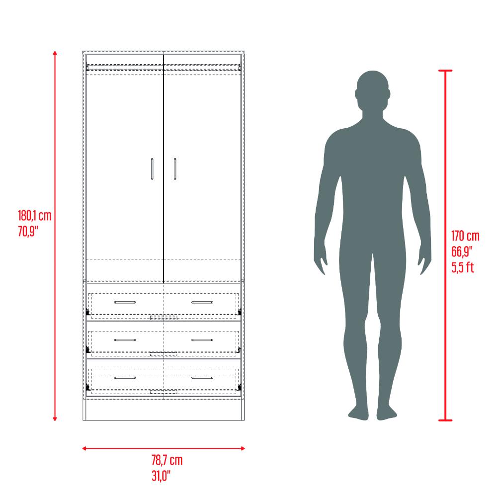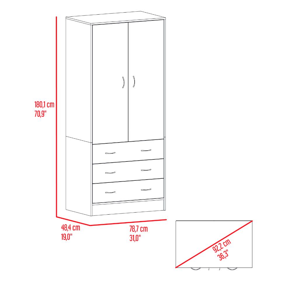 Closet, debe ser anclado a la pared, incluye los elementos para hacerlo, espacio para colgar ropa, cajones con gran capacidad de almacenamiento.