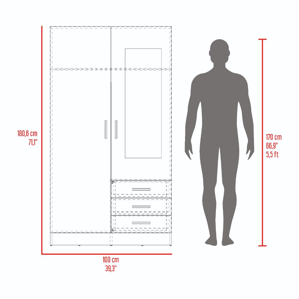 Closet, con 2 puertas abatibles, 3 cajones, cuenta con diversos espacio para ropa y accesorios, incluye espejo con medidas de 90x30 cm, y es de facil instalación.