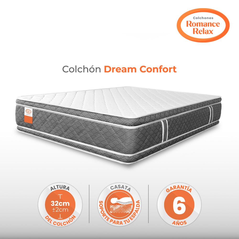 El colchón Dream Confort de colchones Romance Relax tiene una altura de 32 cm que combina una estructura de cinco capas de espuma que equilibran perfectamente suavidad y soporte, brindando una experiencia de descanso envolvente y anatómica. Su núcleo en espuma producida en Colombia con tecnología alemana, soportado por capas de espuma casata de alta firmeza, proporciona una superficie sólida que mantiene la alineación de la columna y ofrece mayor resistencia al peso sin deformarse con el uso. Las capas superiores tipo pillow brindan una sensación de acogida progresiva y suave desde el primer contacto, mientras que la capa intermedia favorece una transición equilibrada y ergonómica. Su tela en tejido de punto aporta una superficie agradable al tacto, fresca y adaptable al movimiento del cuerpo durante la noche. Soporta hasta 120 kg por persona y cuenta con una garantía de 6 años, convirtiéndose en la opción ideal para quienes desean una combinación de confort, soporte inteligente y tecnología de alto desempeño para dormir mejor cada día.
