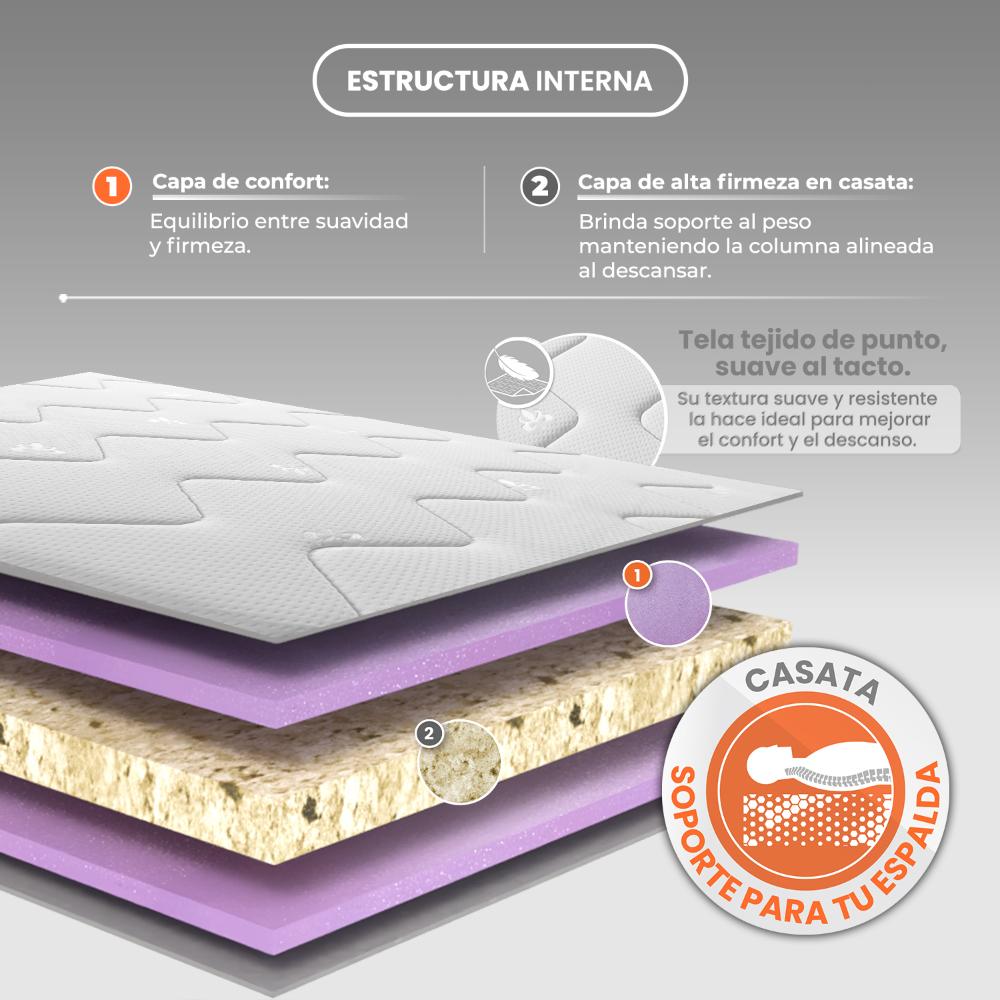 El colchón Power Dream Pedic de Colchones Romance Relax con 28 cm de altura está diseñado para brindar un descanso firme y duradero, ideal para quienes buscan una superficie sólida que favorezca la correcta postura corporal. Su composición 100% en espuma de alta densidad con tecnología alemana permite un soporte superior que se adapta a la forma del cuerpo sin perder durablidad, mientras que su núcleo en espuma casata proporciona resistencia al peso y mayor vida útil sin deformaciones. Las capas intermedias generan una transición entre firmeza y confort. La tela tejido de punto suave, que además de ser agradable al tacto, favorece la ventilación y la frescura durante el descanso. Con capacidad de soporte de hasta 120 kg por persona y garantía de 5 años, este colchón es una excelente opción para quienes desean firmeza, durabilidad y un descanso profundamente reparador.
