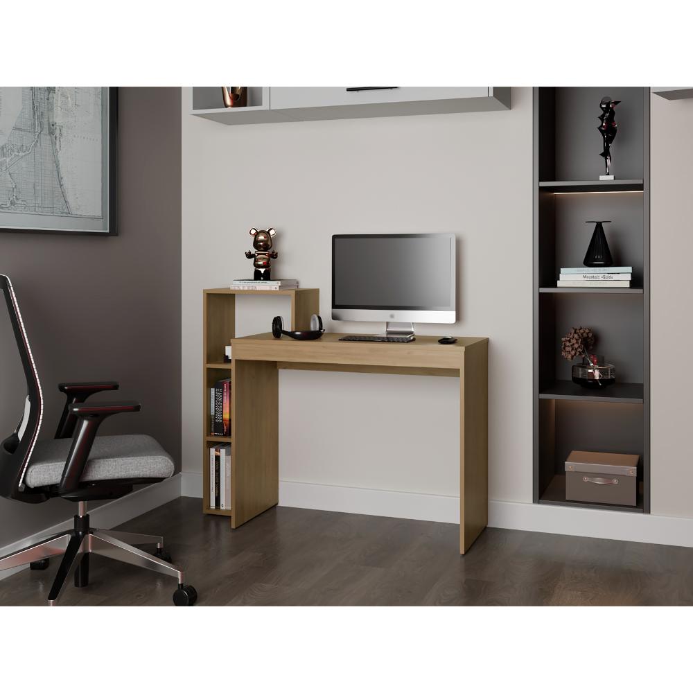Escritorio, con amplia superficie de trabajo, múltiples espacios para ubicar objetos, diseño sencillo