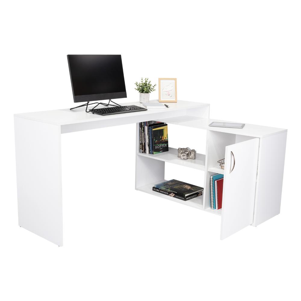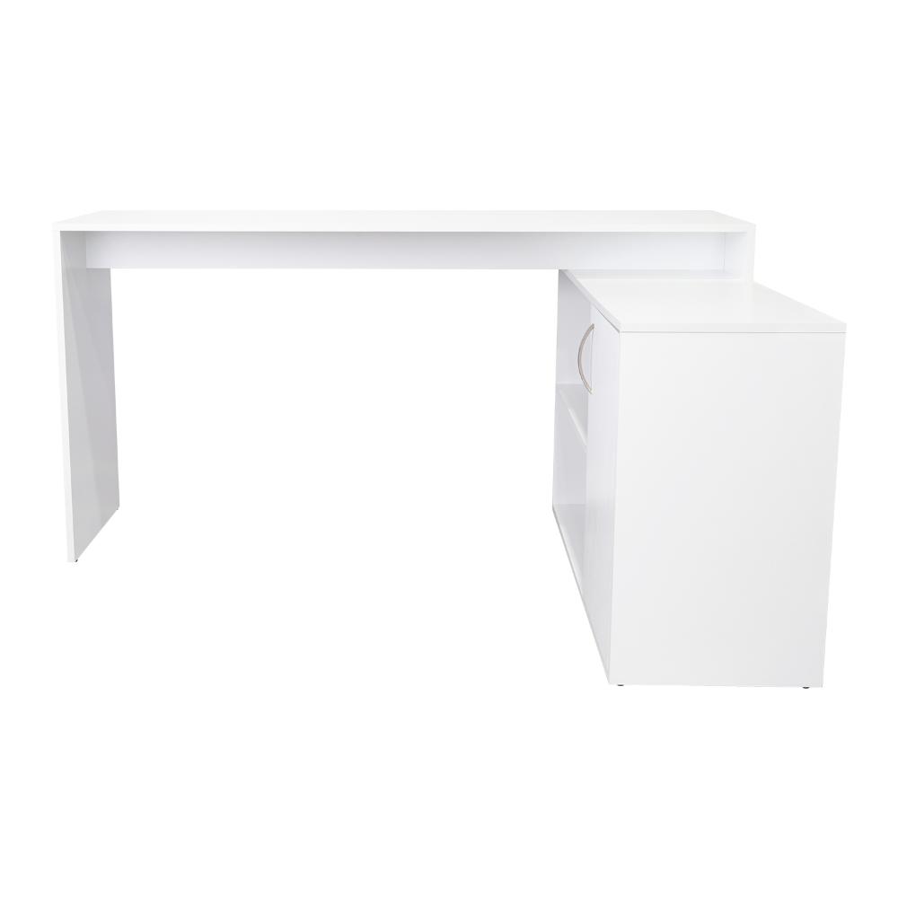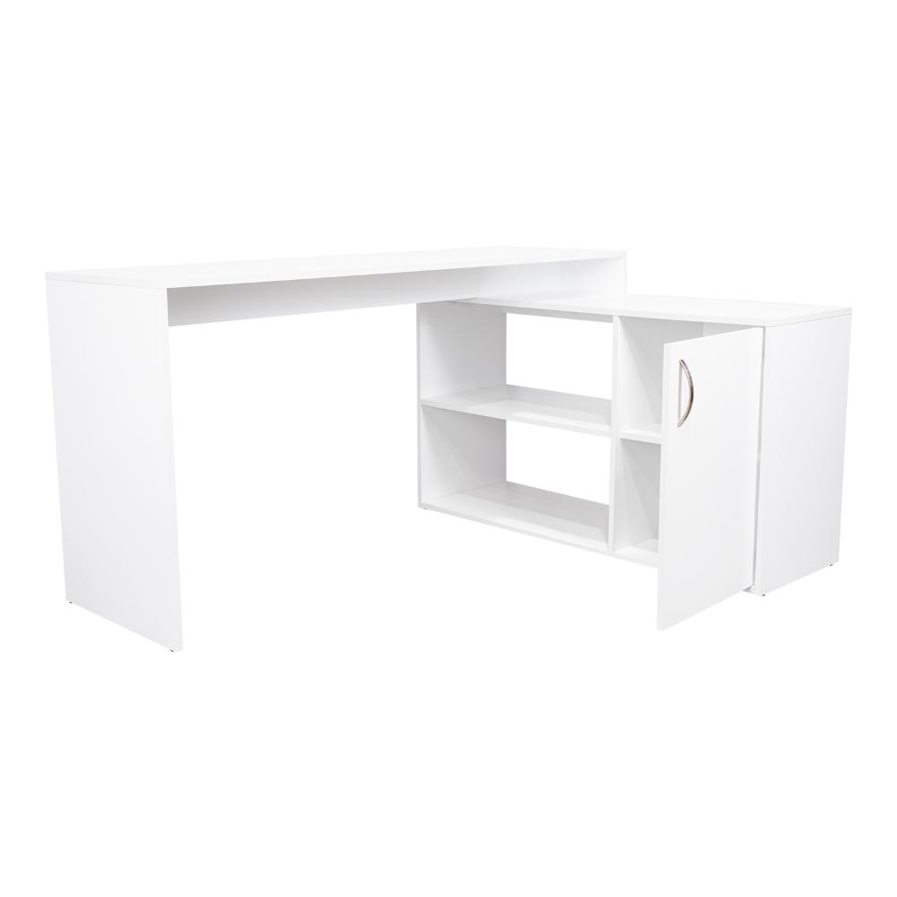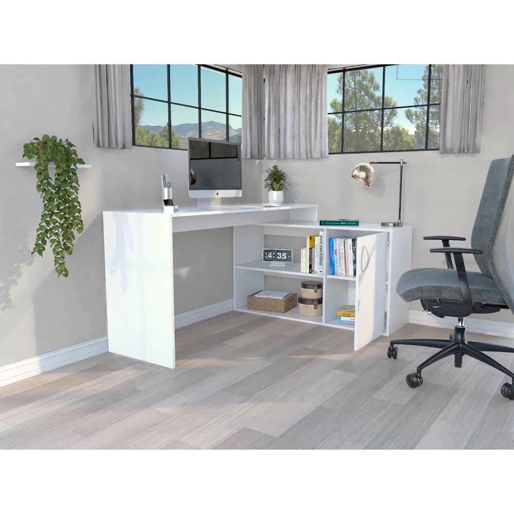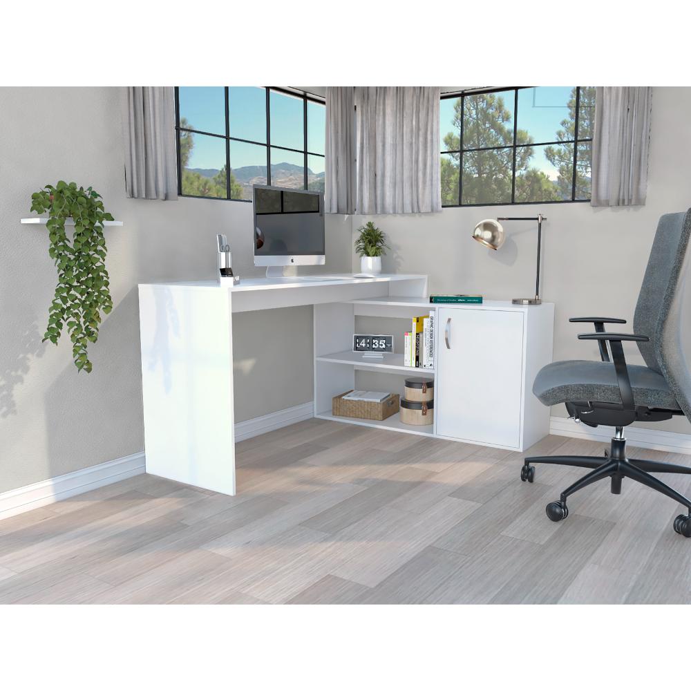 Escritorio en L, cuenta con amplia superficie de trabajo y el eje de lateral tiene amplios entrepaños para ubicar libros u otros elementos de trabajo y estudio, y un práctico espacio con puerta para almacenar múltiples objetos. Ideal para el hogar o la oficina, incluye manual para ensamble.