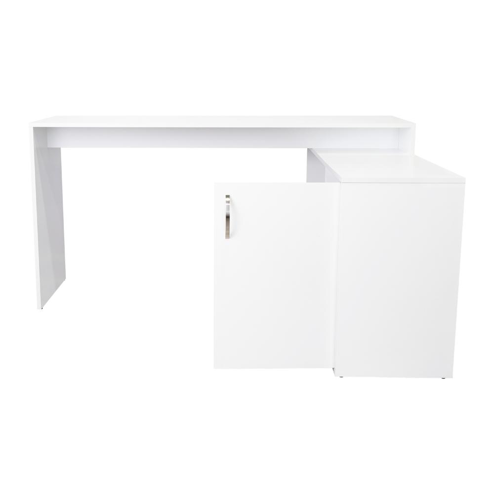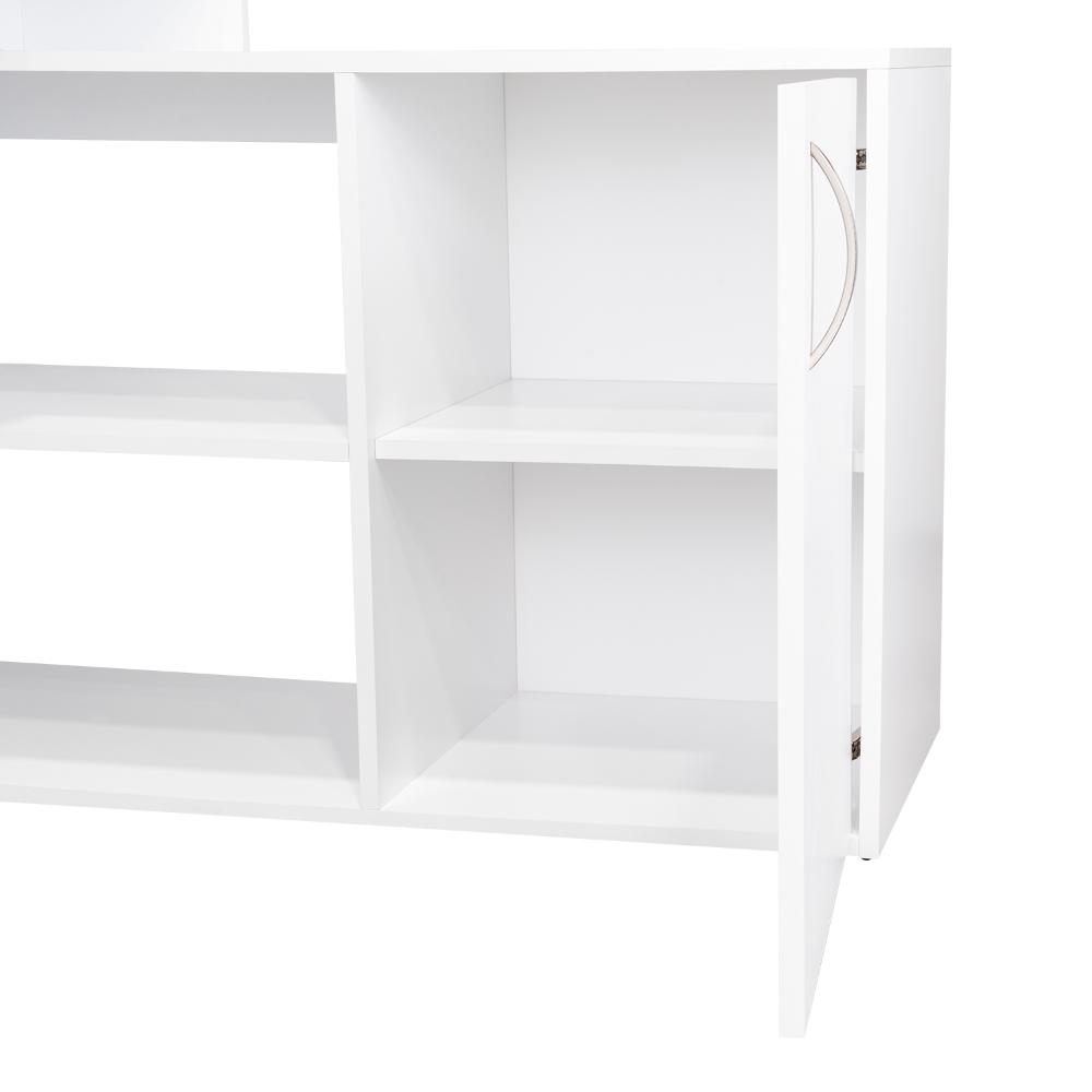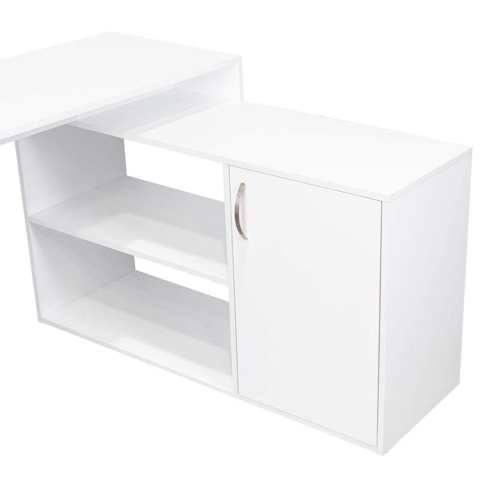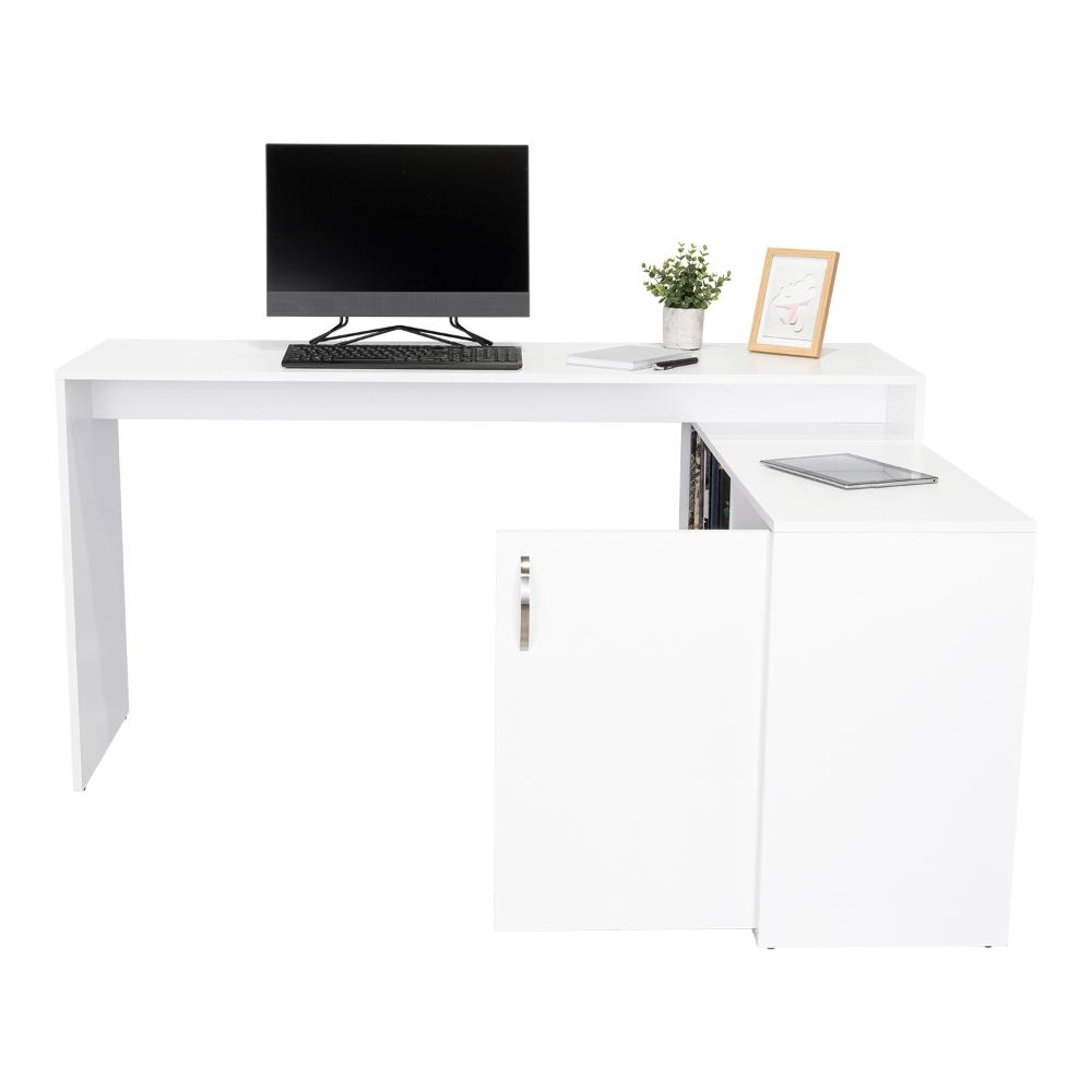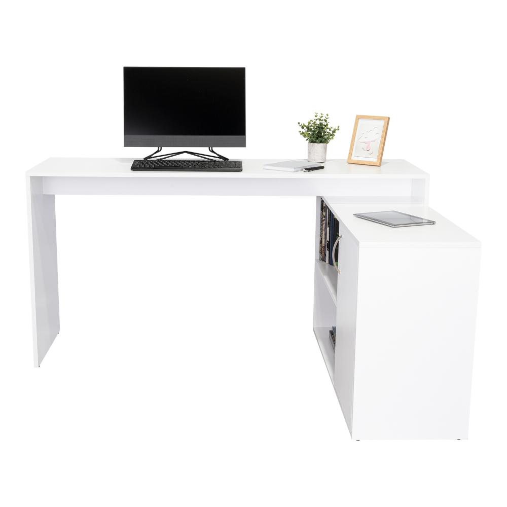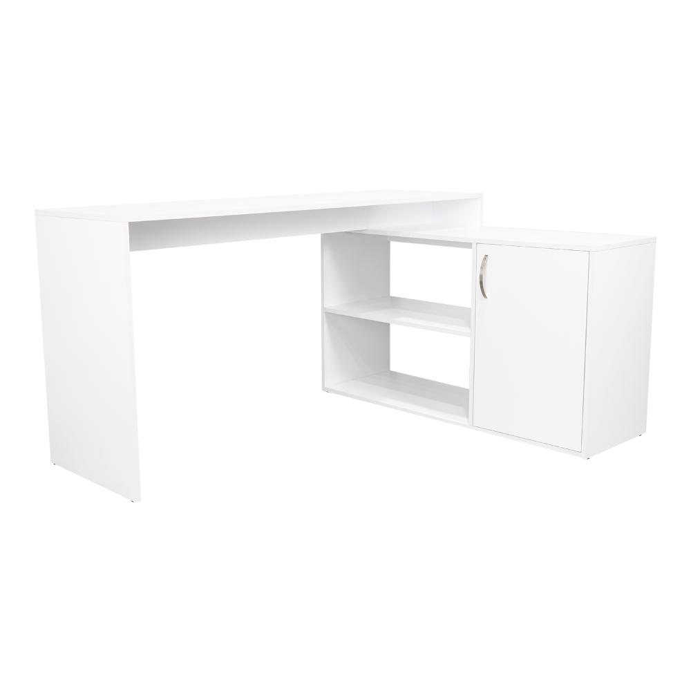 Escritorio en L, cuenta con amplia superficie de trabajo y el eje de lateral tiene amplios entrepaños para ubicar libros u otros elementos de trabajo y estudio, y un práctico espacio con puerta para almacenar múltiples objetos. Ideal para el hogar o la oficina, incluye manual para ensamble.