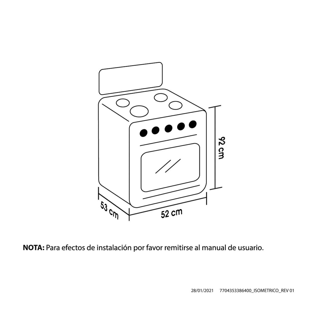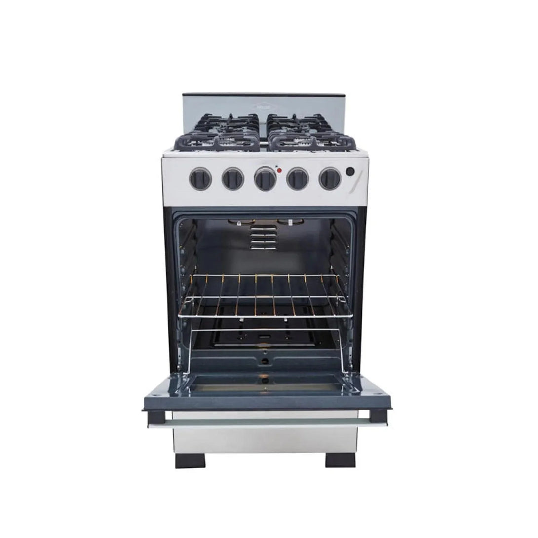Una Estufa con acabados brillantes que hará lucir tus espacios amplios, 50 cms de ancho, con puerta del horno en vidrio espejo, parrillas en hierro fundido y fogones de diferentes tamaños. El horno ofrece un gran espacio interior y varios niveles de ubicación del entrepaño que además es retráctil para que cocines lo que quieras y des el toque dorado al final usando el gratinador eléctrico