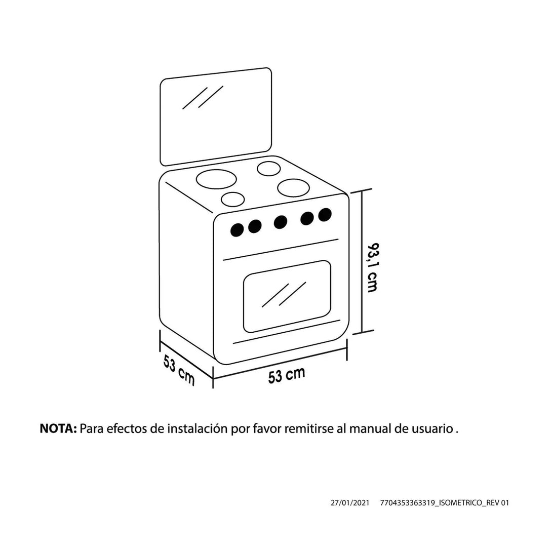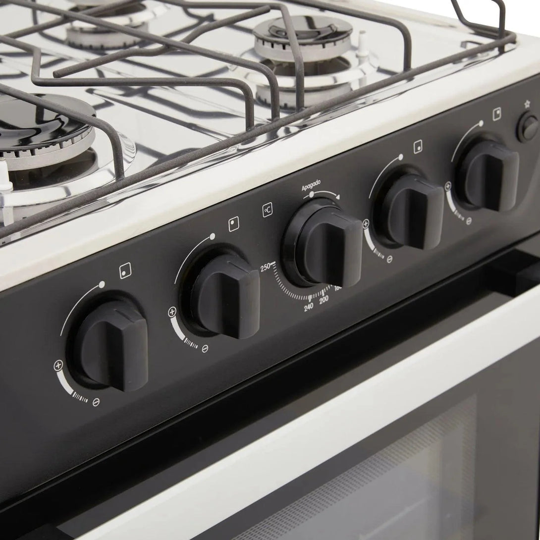 Estufa Haceb de 50 cms de ancho con mesa en acero inoxidable de gran durabilidad, fácil limpieza, parrilla antideslizante, resistencia al calor y elegancia. Cuenta con quemadores de diferentes tamaños, encendido eléctrico, vidrio superior templado para proteger de salpicaduras y soportes inferiores robustos para que cocines con tranquilidad y dejes todo impecable como te gusta. ¡El horno tiene visor amplio para hacerle seguimiento a tus recetas!