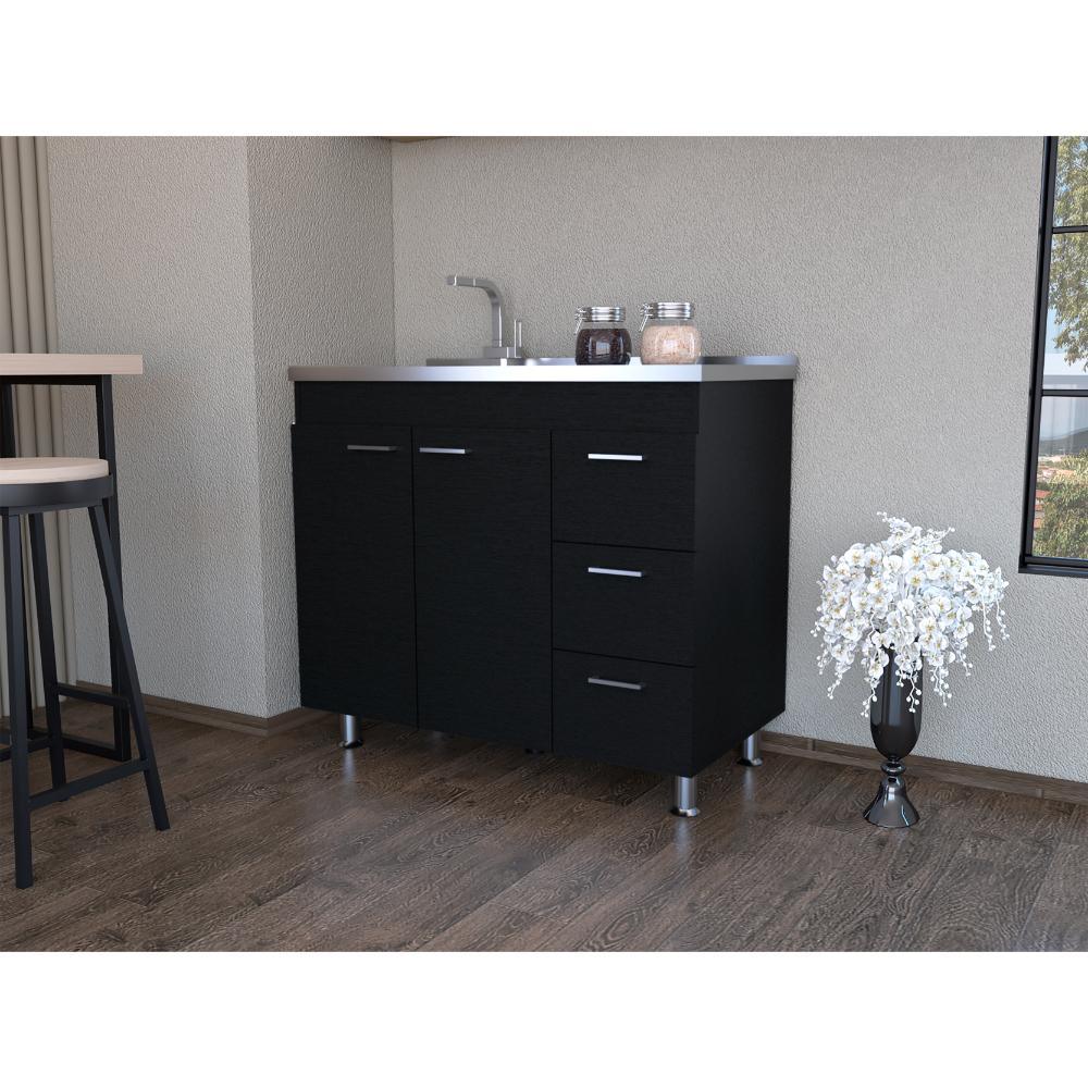 Gabinete Inferior, con dos puertas batientes, tres cajones deslizables, manijas y patas metálicas, con Mesón Izquierdo.