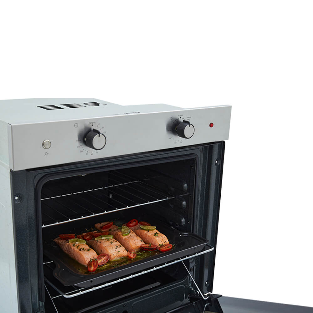 Horno mixto Tofu de 60 cm de ancho con funcionamiento a gas y gratinador eléctrico en curvas que dará un toque crujiente y dorado a las recetas. Cuenta con tecnología de cocción envolvente para acabados homogéneos, entrepaño retráctil que te acerca las recetas al abrir el horno brindándote practicidad y seguridad y tecnología Low E que garantiza baja emisividad de calor hacia el exterior. El horno tiene un amplio espectro visual e iluminación interna para hacer seguimiento a tus recetas, además, incluye una versátil bandeja asadora y un entrepaño extra. Para complementar, la limpieza será un proceso fácil gracias a las superficies con pocas porosidades, el vidrio extraíble y la puerta desmontable. Línea de cocinas Haceb; recetas deliciosas, en su punto y en menos tiempo.