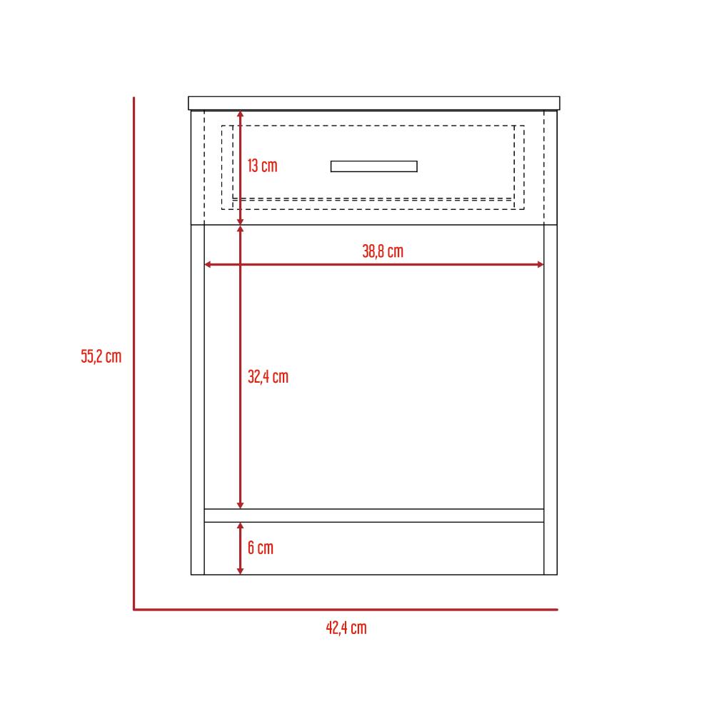 Mesa de Noche, con superficies para ubicar pertenencias, cajon para almacenar, y espacio para lámpara de mesa.