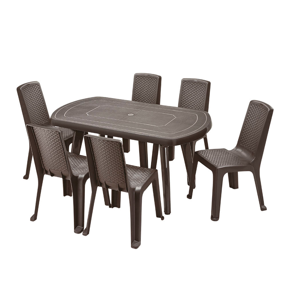 Mesa de tamaño familiar ideal para 6 puestos, larga, resistente, fácil de armar y de limpiar. Con filtro UV para uso en exteriores e interiores. Úsala con 6 sillas como comedor principal o auxiliar. Un producto diferenciado y estable. Diseño clásico que combina con los diversos estilos del hogar.