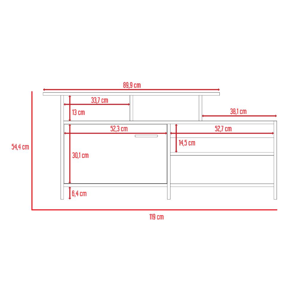 Mesa para TV de 40", con espacio para objetos de audio y video, y 1 puerta abatible con manija metálica.