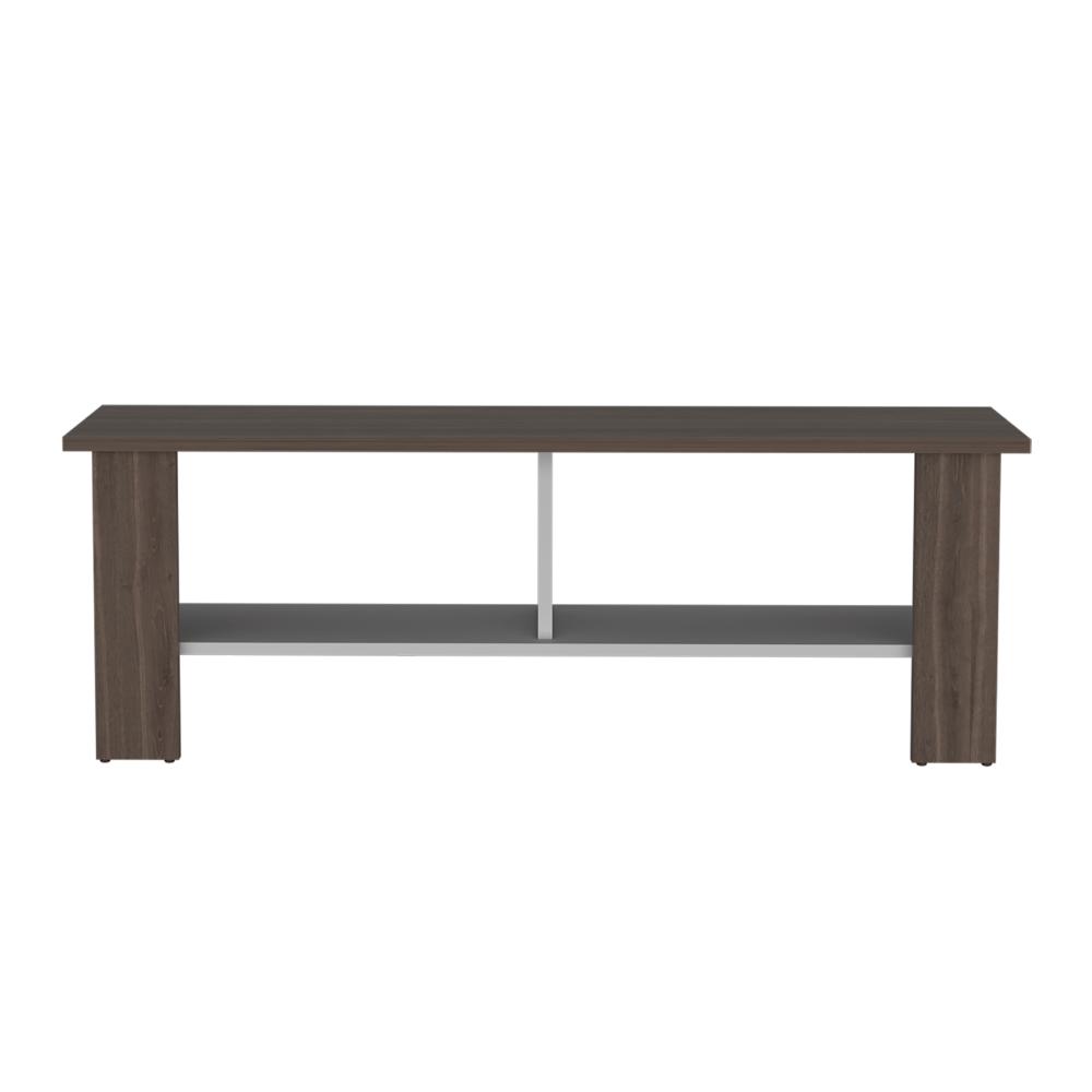 Mesa para TV de 65". cuenta con un entrepaño y dos compartimentos para almacenar objetos.