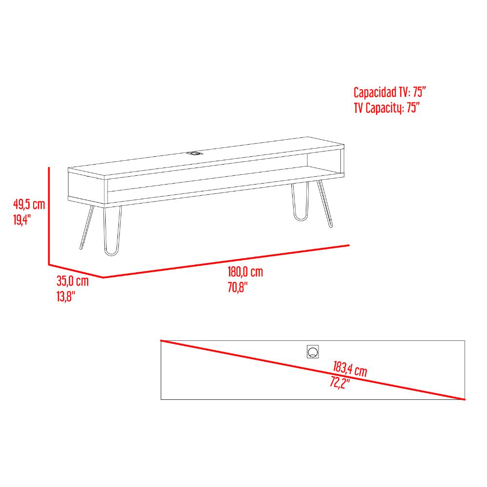 Mesa de TV, con un diseño contemporaneo, cuanta con espacio para ubicar objetos de audio de video, patas metalicas, incluye pasa cables, y con espacio de tv hasta 70 pulgadas