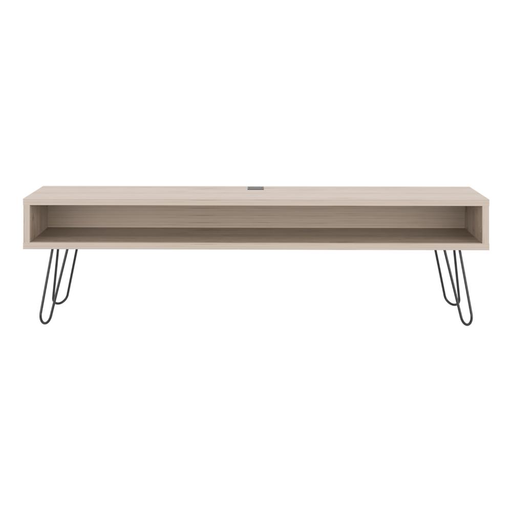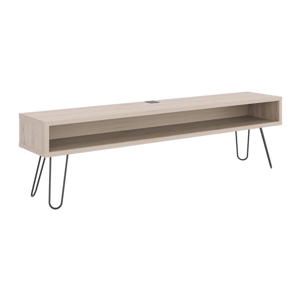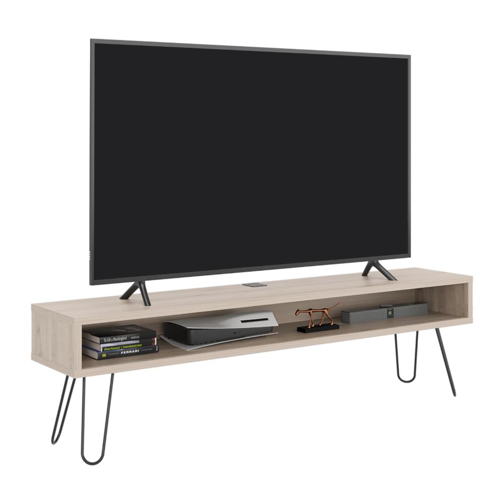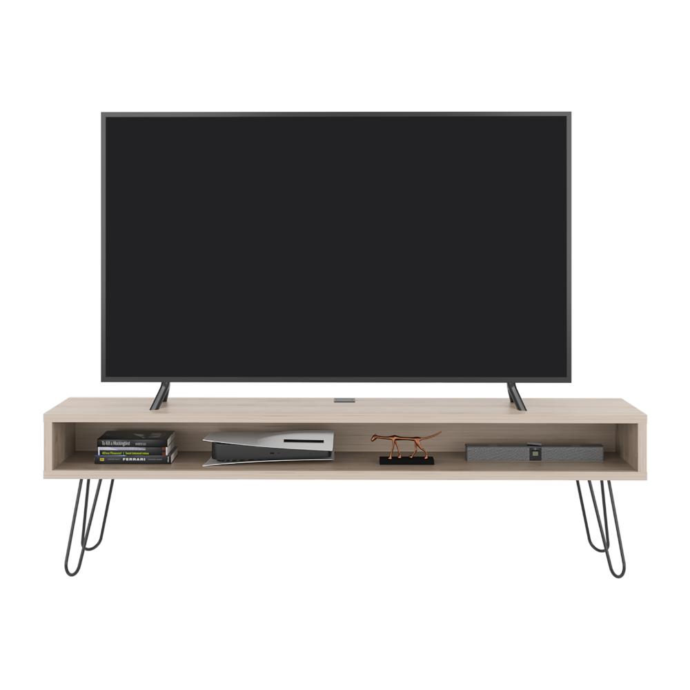 Mesa de TV, con un diseño contemporaneo, cuanta con espacio para ubicar objetos de audio de video, patas metalicas, incluye pasa cables, y con espacio de tv hasta 70 pulgadas
