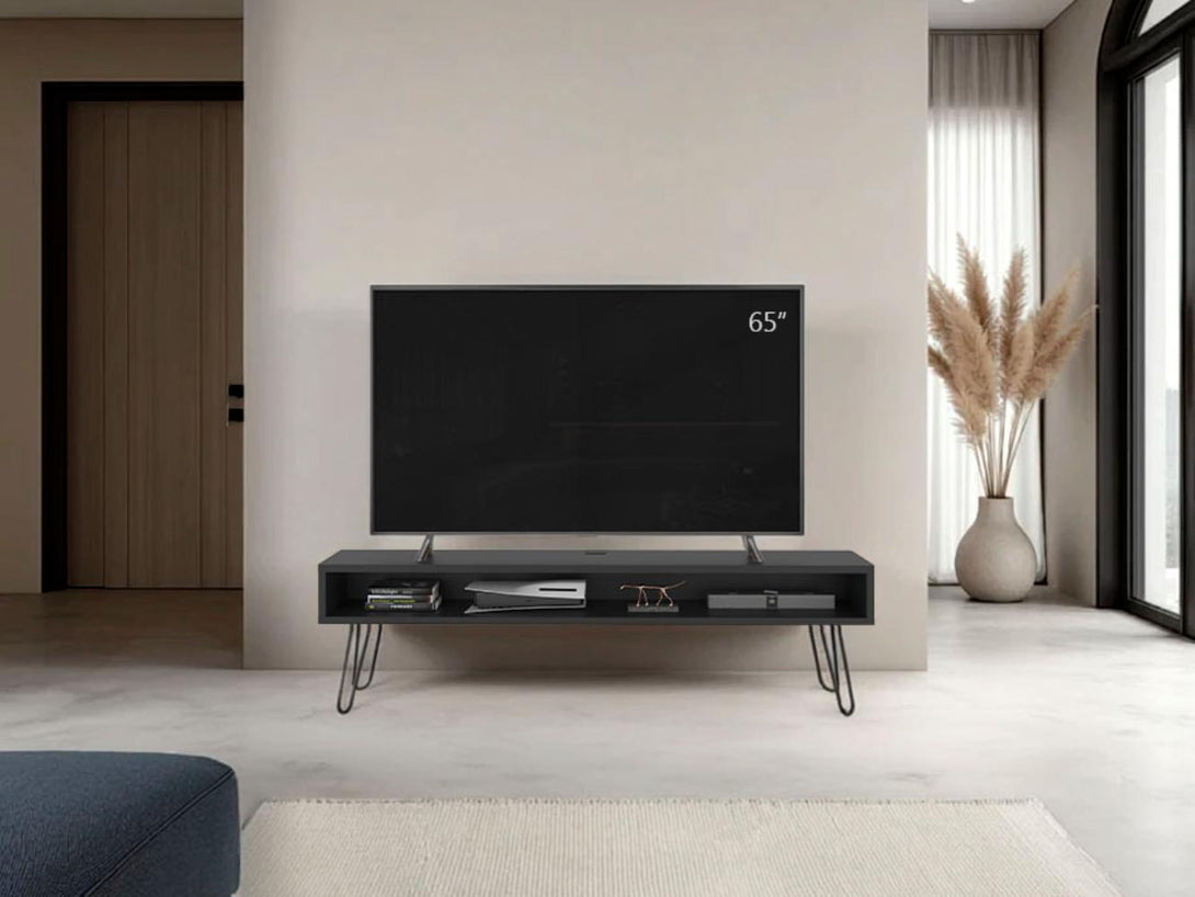 Mesa de TV, con un diseño contemporaneo, cuanta con espacio para ubicar objetos de audio de video, patas metalicas, incluye pasa cables, y con espacio de tv hasta 70 pulgadas