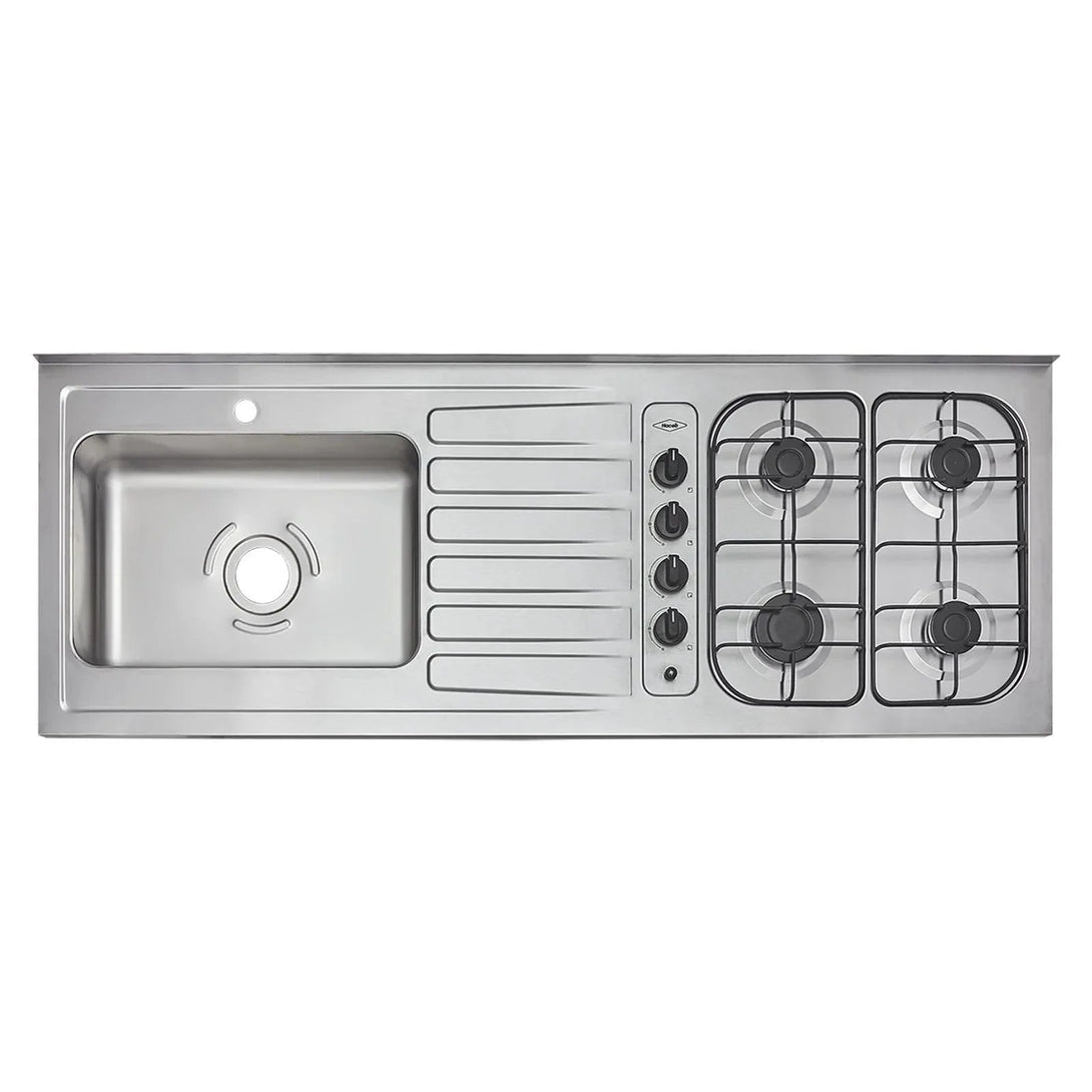Mesón en acero inoxidable de 1.50 metros de ancho, con ubicación izquierda del pozuelo. con encendido, 4 fogones a gas natural con parrillas en alambrón con puntos de apoyo óptimos por recipiente para más seguridad. Cuenta con un sistema de anti-empozamiento en el lavaplatos y prensado en el centro del mesón que evita la acumulación de agua y el desplazamiento de líquidos al interior del mueble.