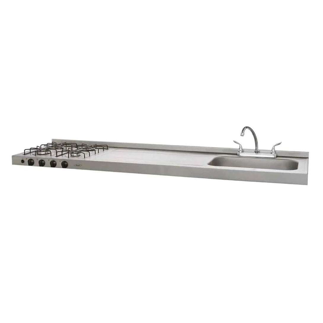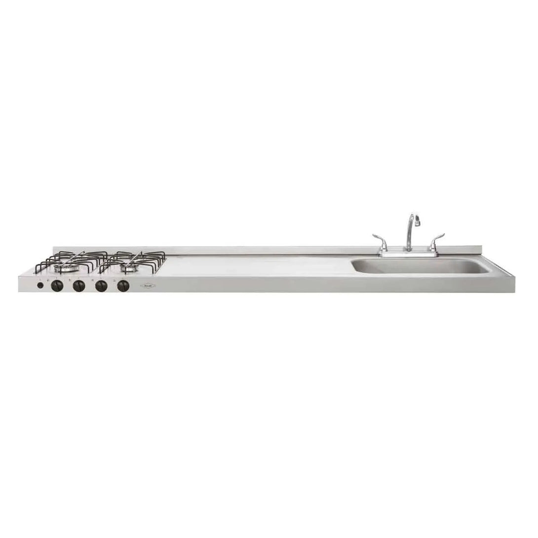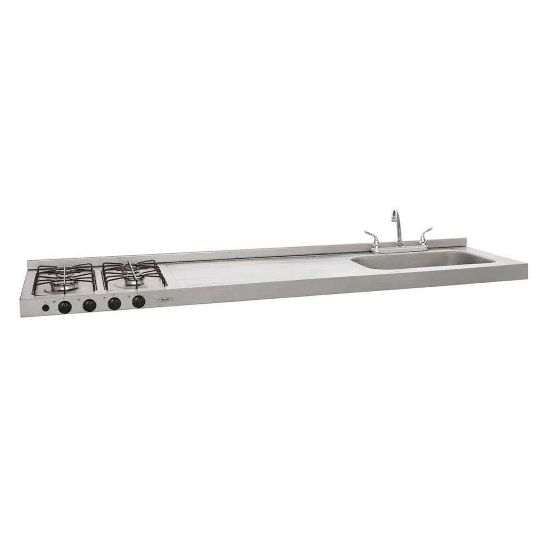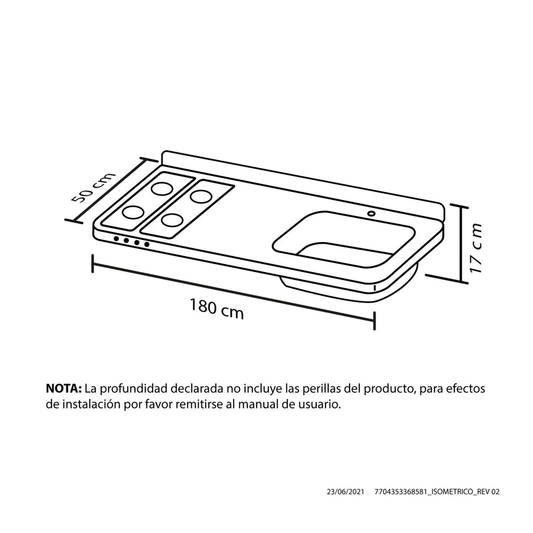 Mesón en acero inoxidable de 1.80 metros de ancho, con ubicación derecha del pozuelo. 4 fogones a gas con parrillas con puntos de apoyo óptimos por recipiente para más seguridad. La ubicación de sus perillas ofrece un mayor espacio para la preparación de tus alimentos. Cuenta con un sistema de anti-empozamiento en el lavaplatos que evita la acumulación de agua.
