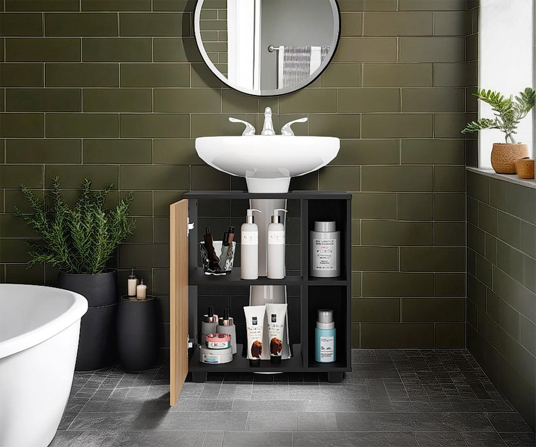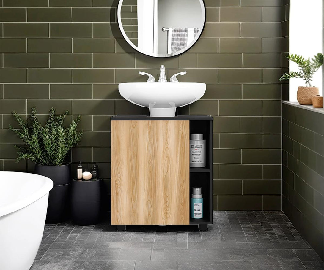 Mueble Lavamanos, de pesdestal moderno, 1 puerta abatible, con espacio para ubicar objetos decorativos y es de facil instalación