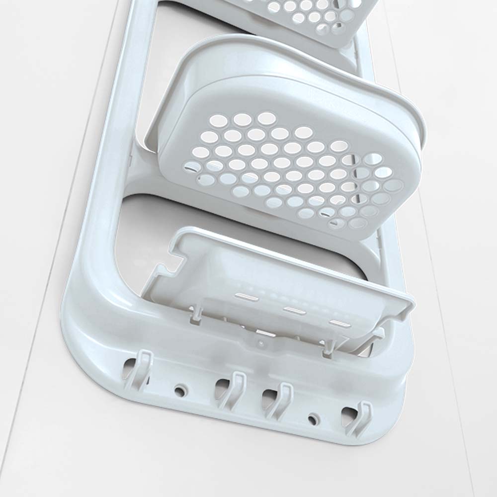 Tres entrepaños con el tamaño ideal de los envases. Bandejas mas profundas y con mayor altura y perforaciones que permiten filtrar el agua y facilitan la limpieza. Adaptador que facilita instalar en cualquier tamaño de grifo ; pared o ducha; se puede retirar o dejar a la preferencia. Jabonera con drenaje y espacio para rasuradora. 4 ganchos para colgar accesorios de ducha.