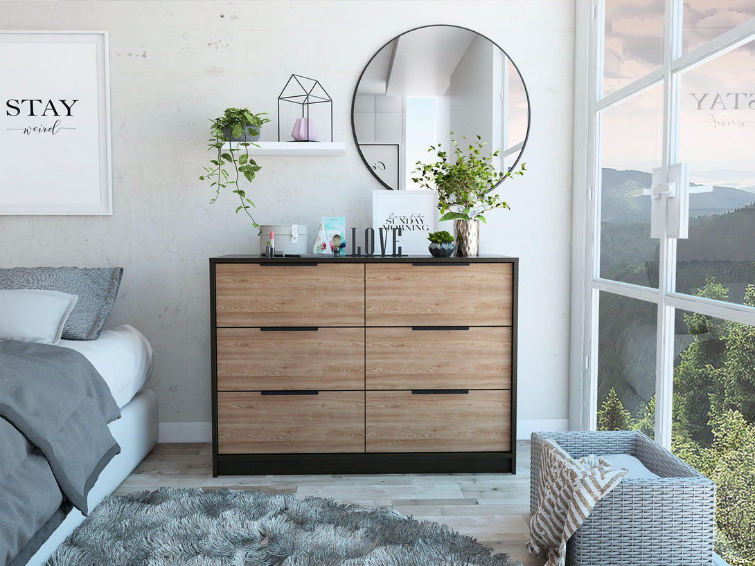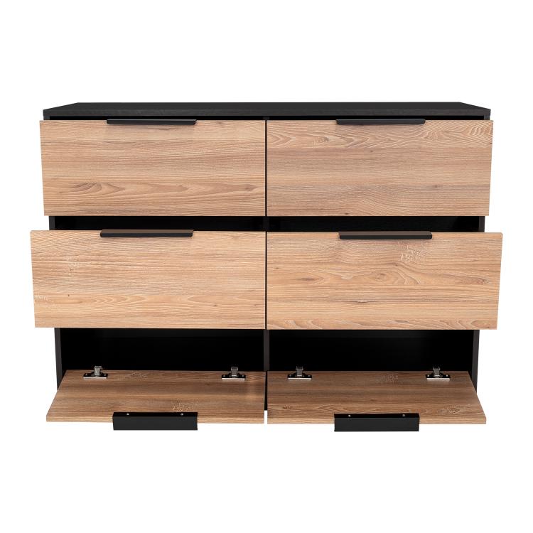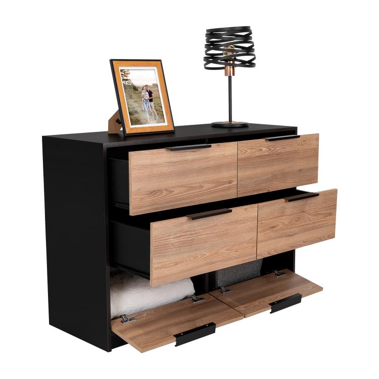 Organizador, con 4 cajones multiusos deslizables con manijas negras, 2 puertas abatibles en la parte inferior.