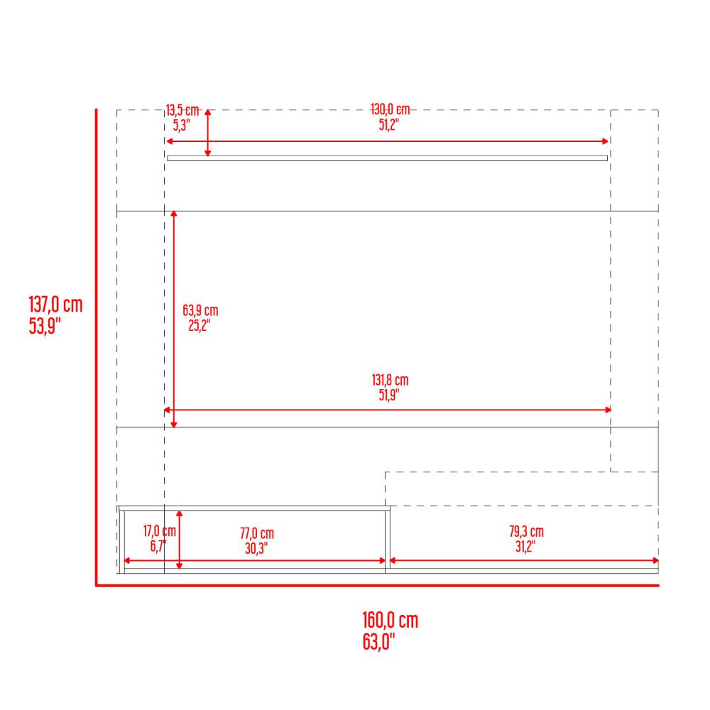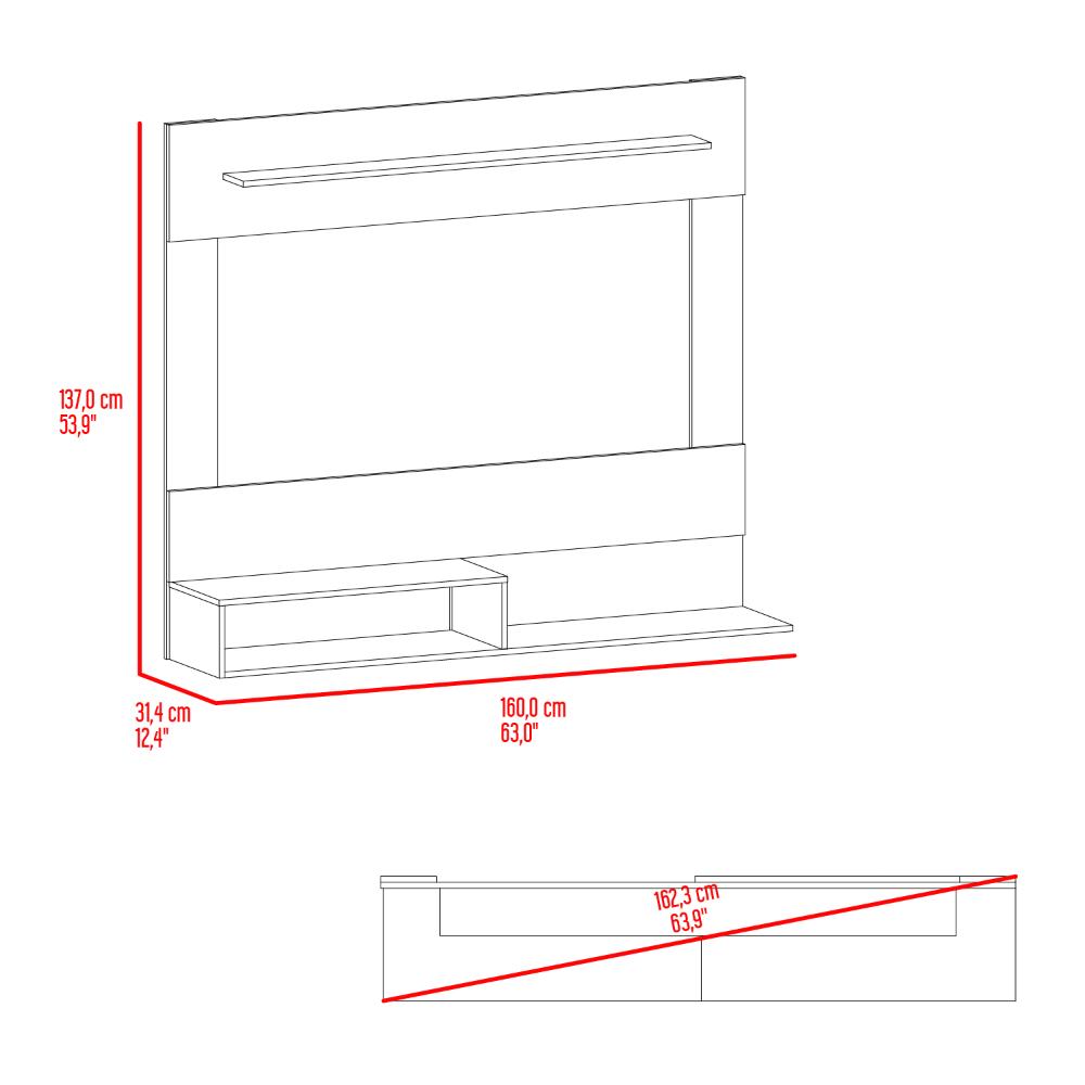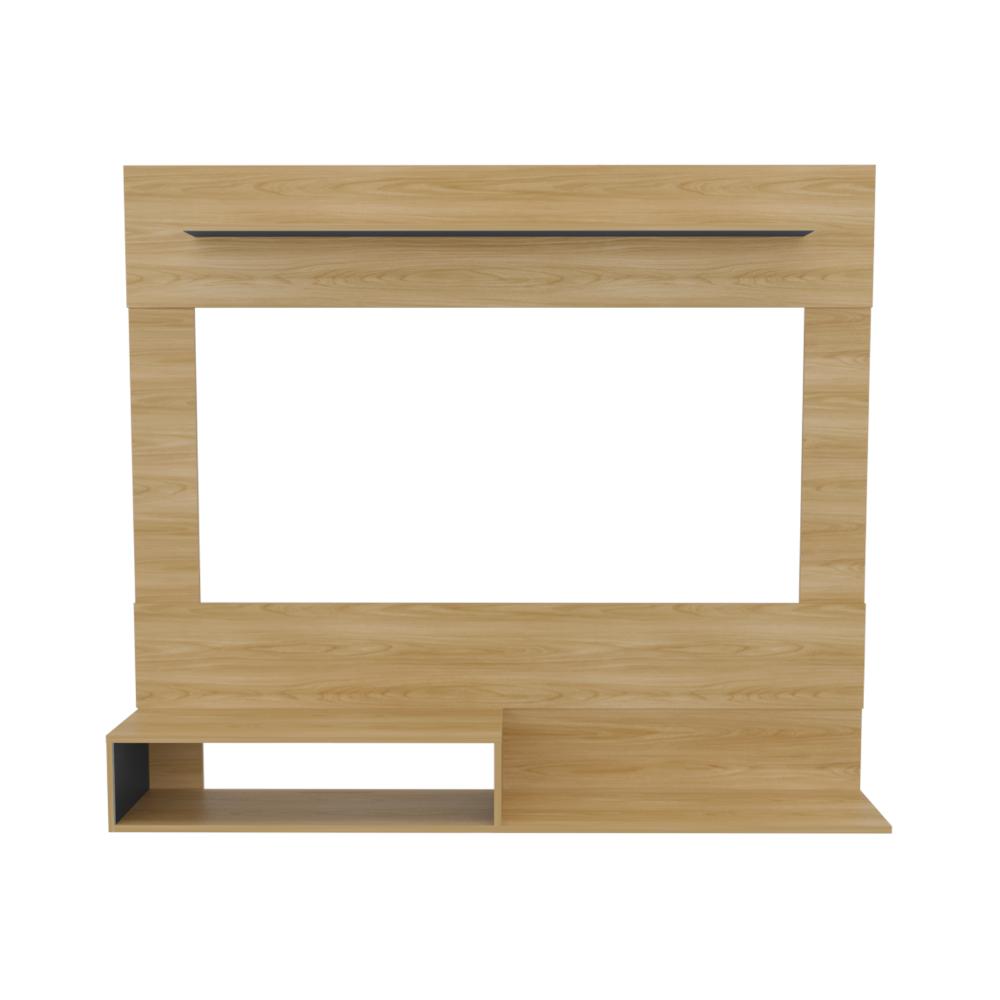 Panel de TV, con espacio para televisor de hasta 70” máximo, diseño moderno, y múltiples entrepaños y superficies para ubicar objetos.