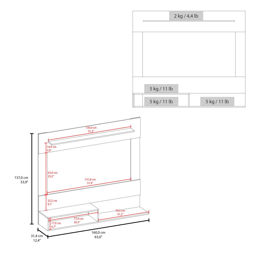 Panel de TV, con espacio para televisor de hasta 70” máximo, diseño moderno, y múltiples entrepaños y superficies para ubicar objetos.