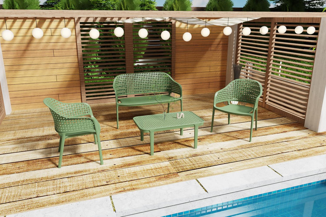 Elaborado en Polipropileno y protección a los rayos UV el set incluye mesa centro, dos sillas y un banco, en Color Verde Olivo